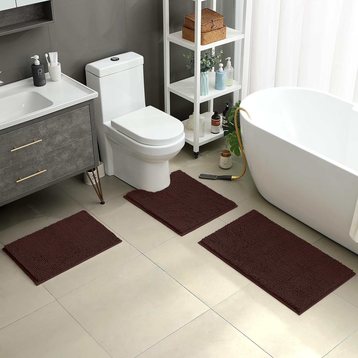 HOMEIDEAS 3 Pieces Bathroom Rugs, Ultra Soft Non Slip Absorbent Chenille Toilet Bath Mat Set (Brown,17"x24"+20"x32"+U Shape 20"x24")