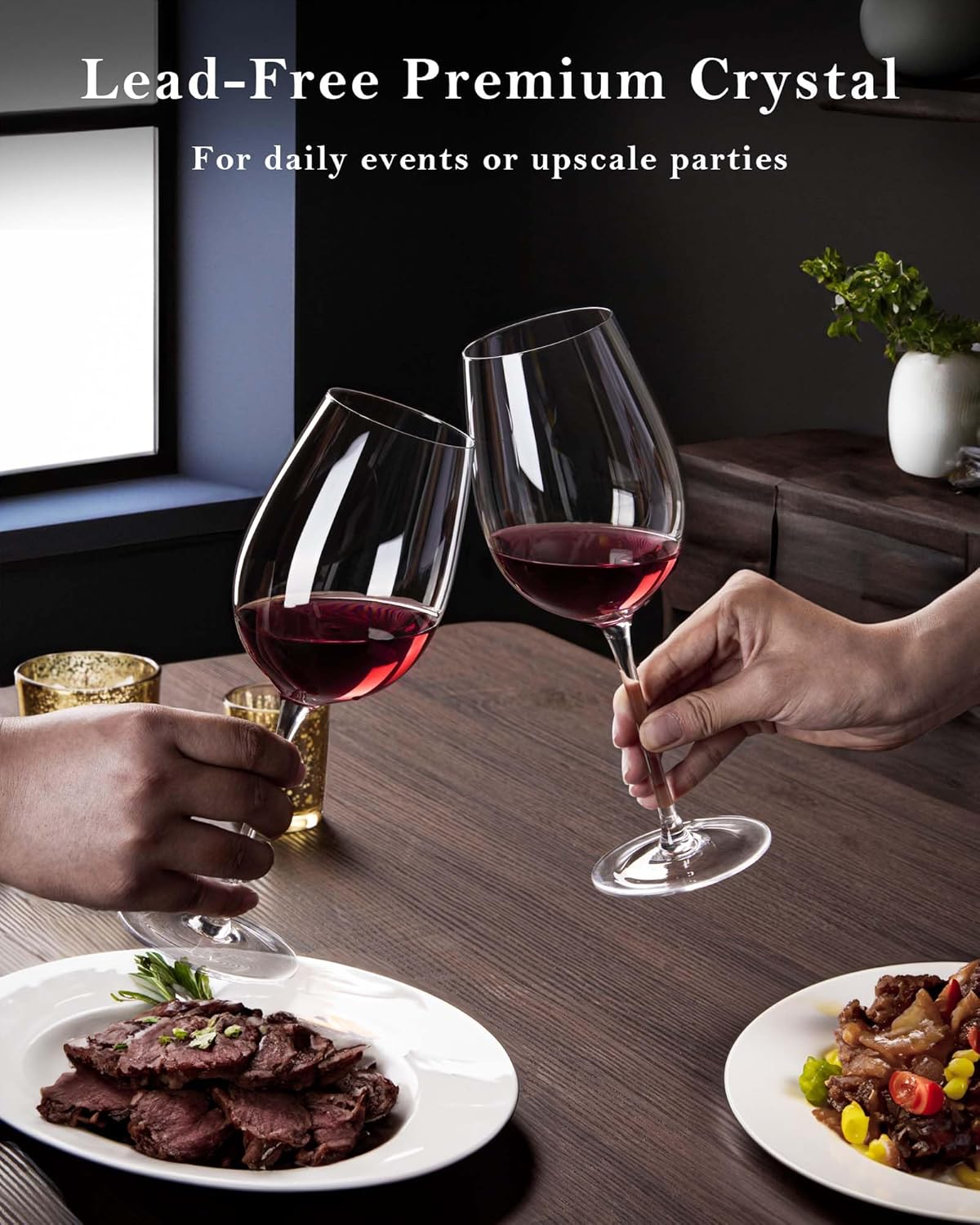 • Ultra Clear and Thin but Sturdy: Crystal Glass is perfectly clear and the ultra thin rim with cold cutting enhancing the perceived quality and flavor of any red/white wine. These red/white wine glasses are not too thick yet strong enough to stand daily washing