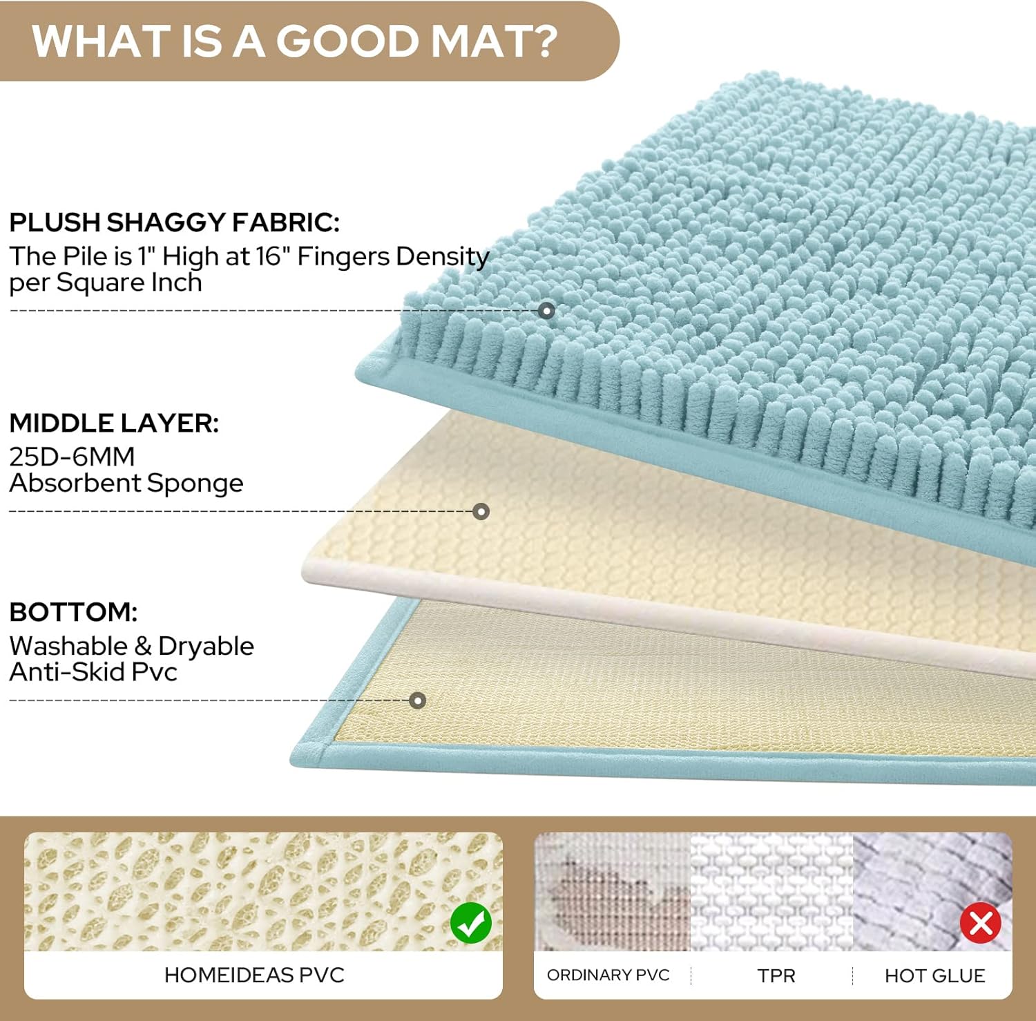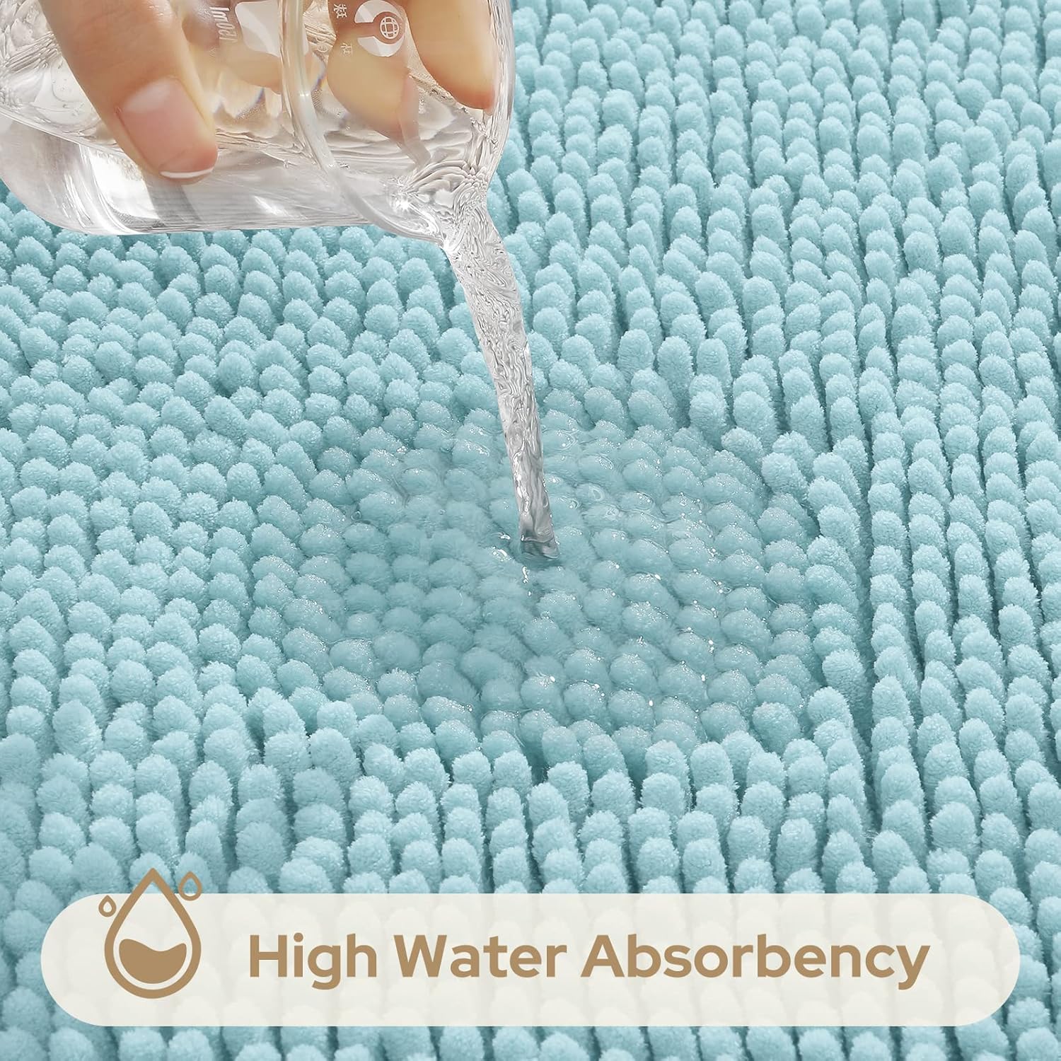 - HIGH WATER ABSORBENCY: High-pile, thick Chenille fabric helps save your floors from dripping water while you're stepping out of the bath, bathtub, shower, or getting ready by the sink. Moisture is trapped in the bathroom mat's deep pile, allowing the rug to dry quickly and cleanly. Place rug on CLEAN DRY SMOOTH FLOOR only. Water under the rug can cause it to slip. Keep bottom of rug dry.