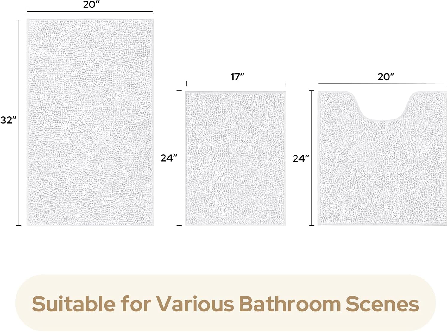 HOMEIDEAS 3 Pieces Bathroom Rugs, Ultra Soft Non Slip Absorbent Chenille Toilet Bath Mat Set (White,17"x24"+20"x32"+U Shape 20"x24")