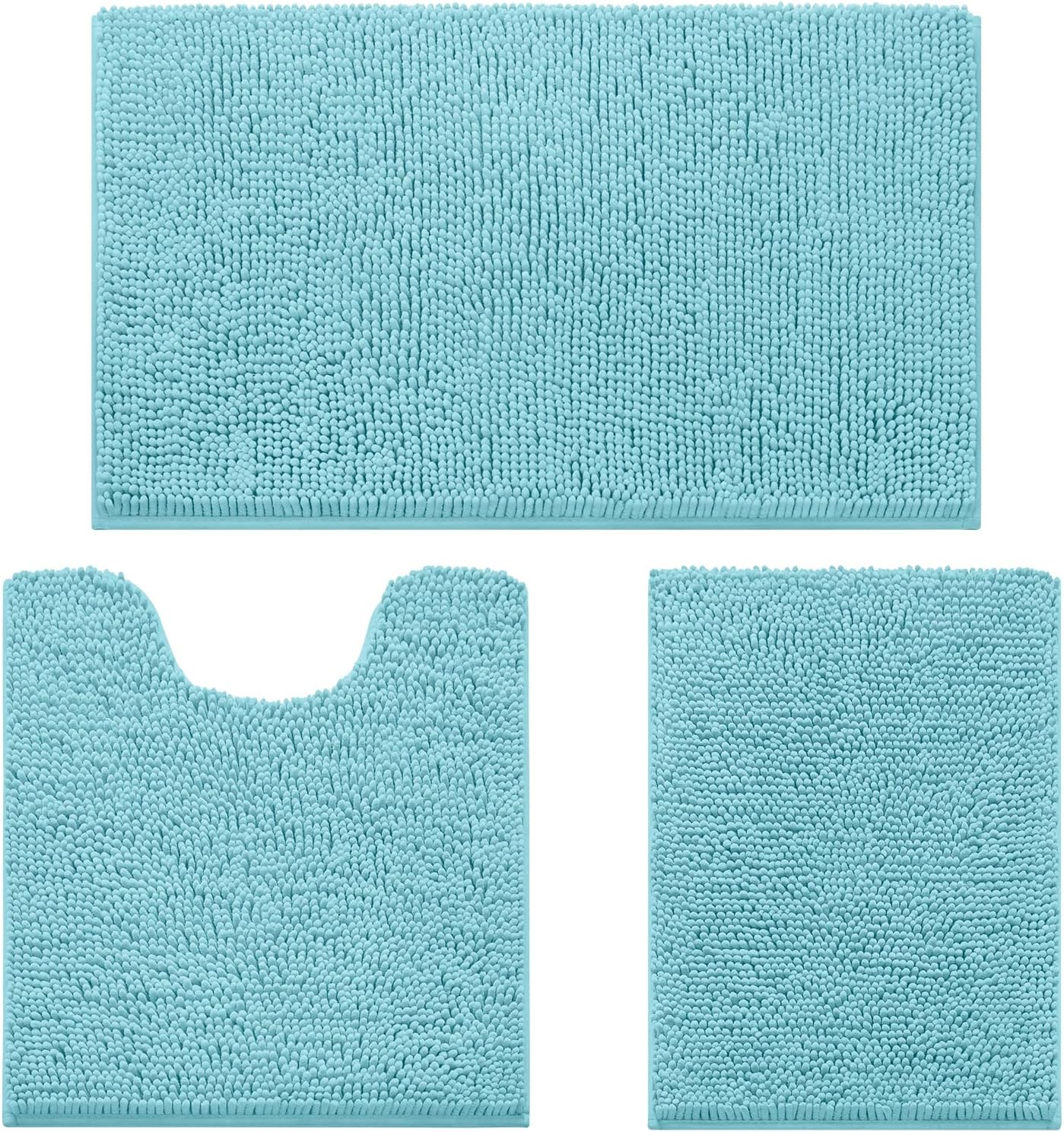 HOMEIDEAS 3 Pieces Bathroom Rugs, Ultra Soft Non Slip Absorbent Chenille Toilet Bath Mat Set (Aqua Blue,17"x24"+20"x32"+U Shape 20"x24")