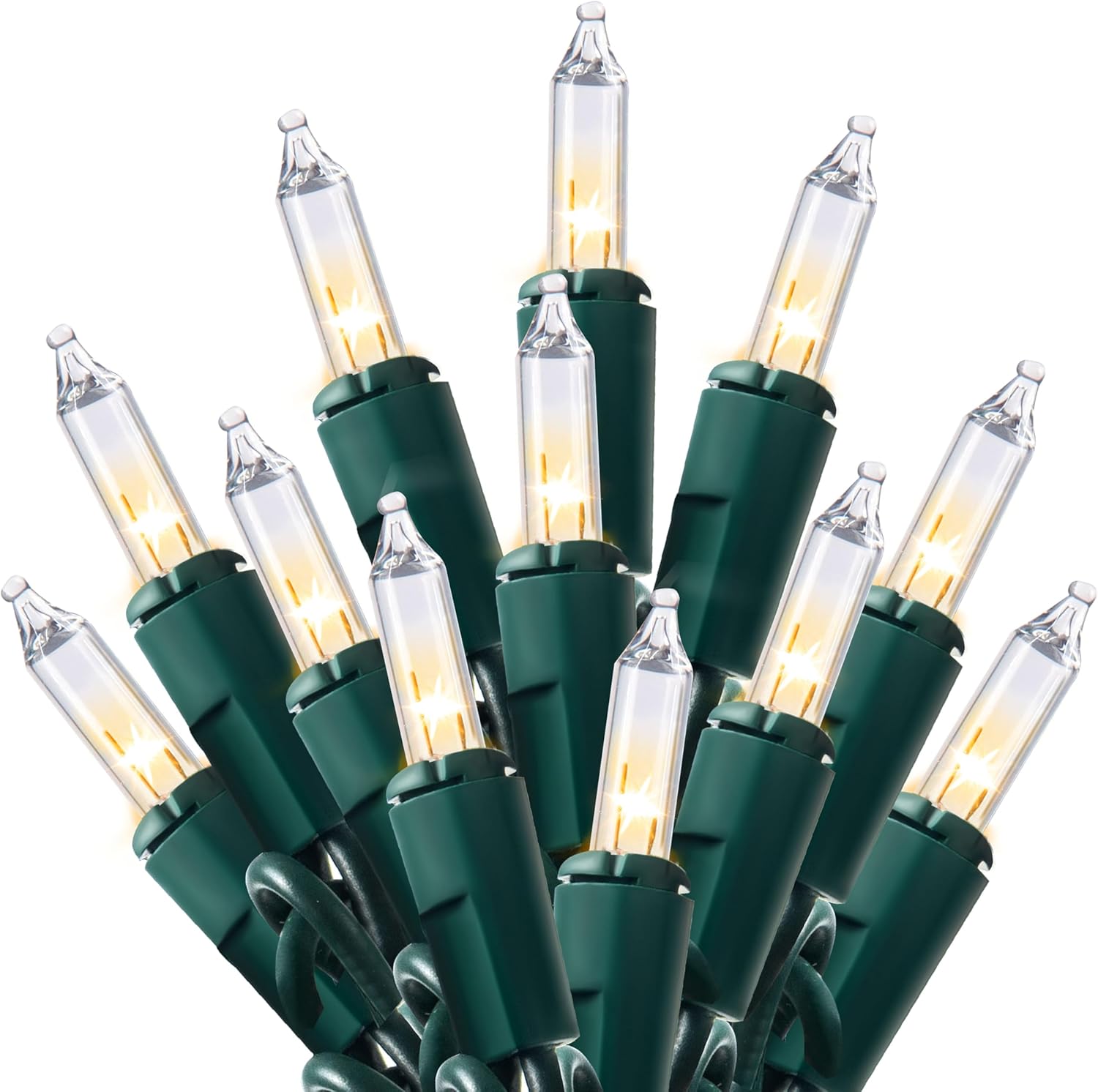 - 100 WARM WHITE MINI LIGHTS - Our Xmas string light total lighted length is 19.4 feet. Total wired length is 21.4 feet. Clear bulb spacing 2.36 inches. Create a magical atmosphere with Old-fashioned tradition bulbs emitting a classic, festive glow. The warm white light is cozy,offer a vibrant, joyful display for any celebration.