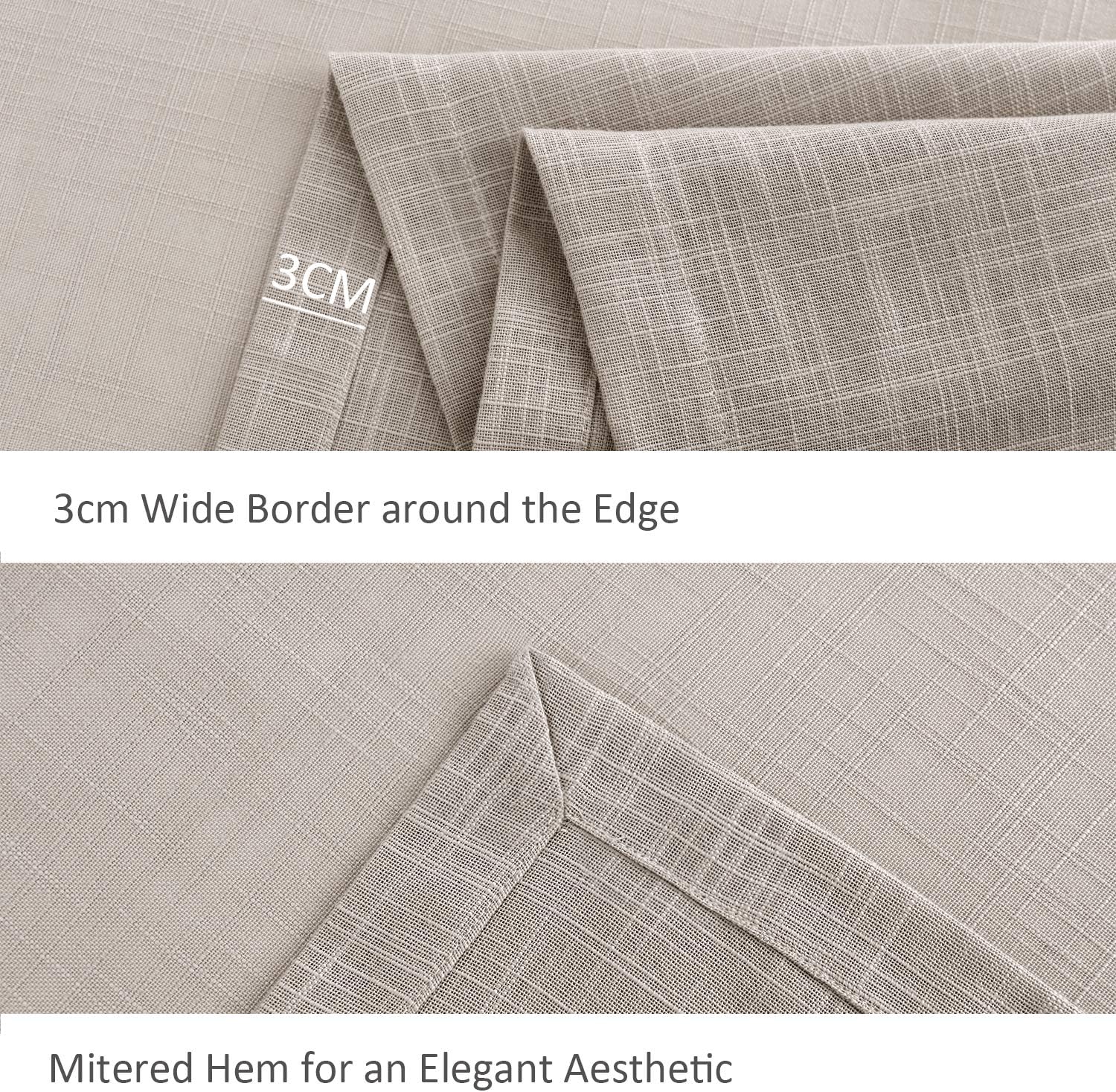 • Our table cloths are made of high-quality polyester faux linen yarn, with slubby texture. It is more durable than real linen yet soft and supple; while protecting table surface, our tablecloth also adds a sense of understated luxury to your dining scene.