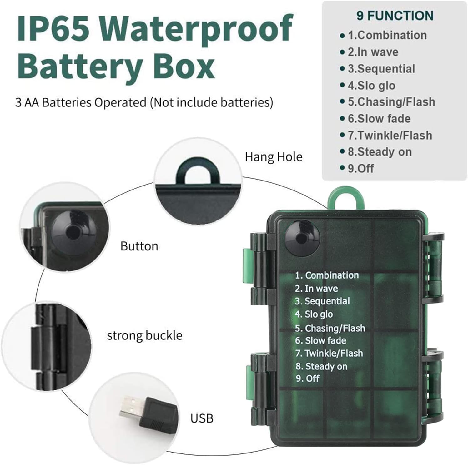 • 8 Modes Memory Function: Press The Button To Select The Mode:Combination,In Wave,Sequential,Slo Glo,Chasing/Flash,Slow Fade,Twinkle/Flash,Steady On.Timer Memory Function Will Be Activated As You Turn The String Lights On