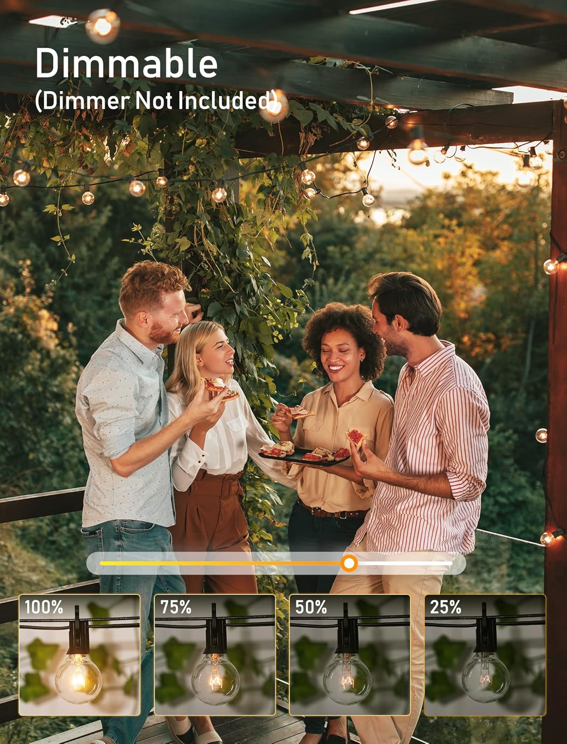 • 【Dimmable Compatible & Energy Saving】G40 outside string light come with 25 glass bulbs and 1 spare bulb. 1.5 inch light bulbs have E12/C7 candelabra socket base, 5W per bulb, warm white dimmable string light help you to save more electricity bill.