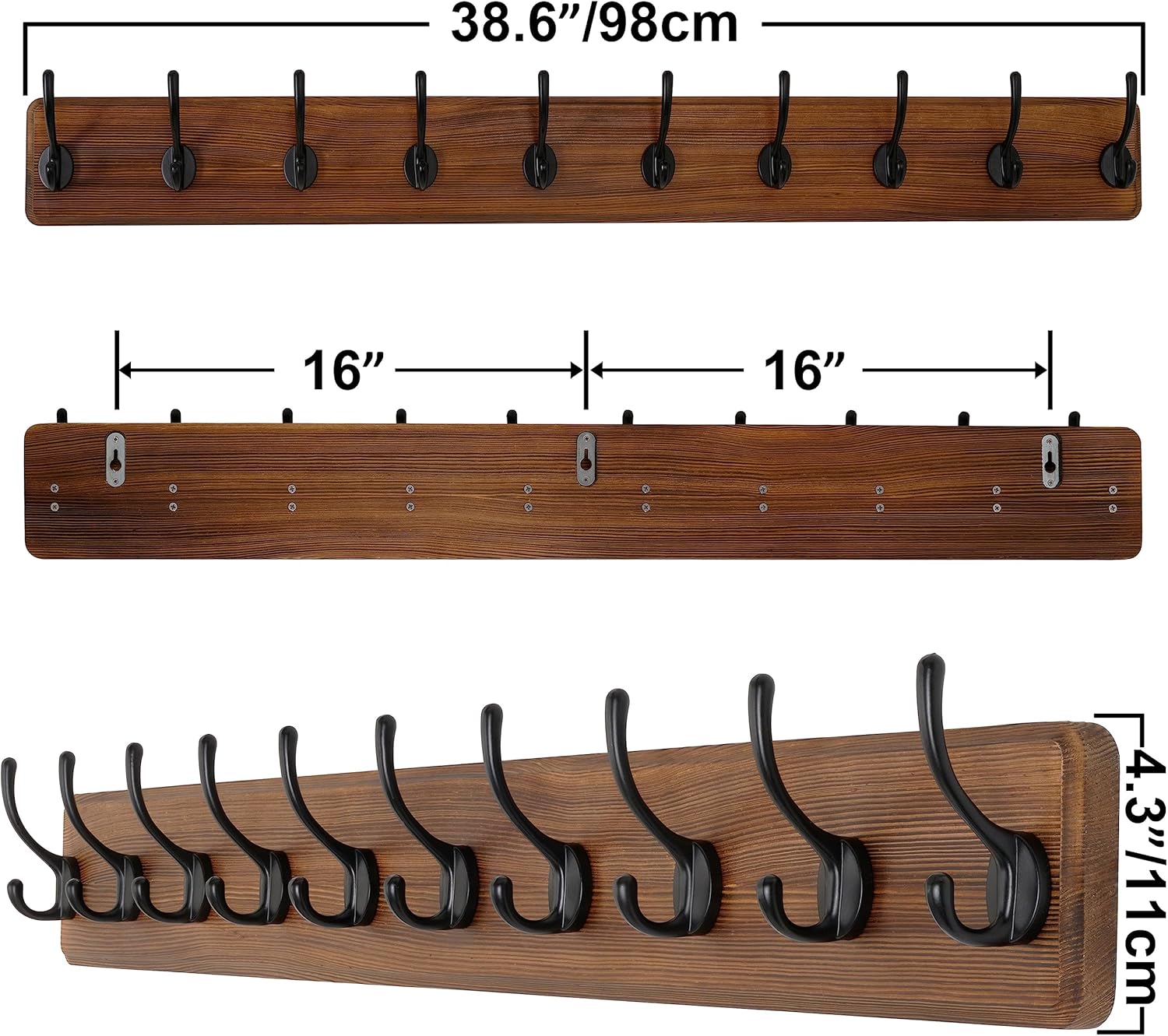 SKOLOO Rustic Wall Mounted Coat Rack, Case of 2, Pine Solid Wood Coat Hook Hanger - 10 Hooks for Hanging Clothes Robes Towels Coats