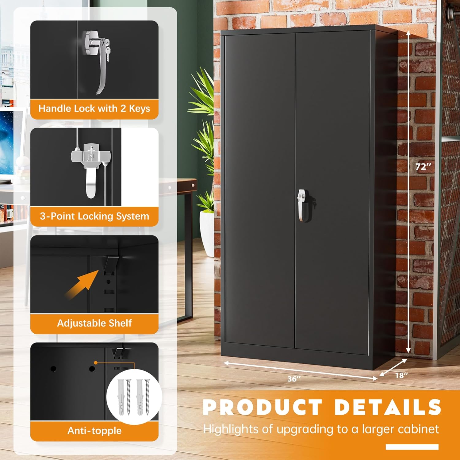 - 【Large space storage】:Greenvelly's new 2025 upgraded oversized metal storage cabinet, 72 X 36 X 17-3/4 inch huge black metal cabinet, can meet most storage needs. The lockable steel garage storage system cabinet with two doors comes with four removable shelves to hold different-sized items as needed. Tool steel storage cabinets are a good choice for businesses.