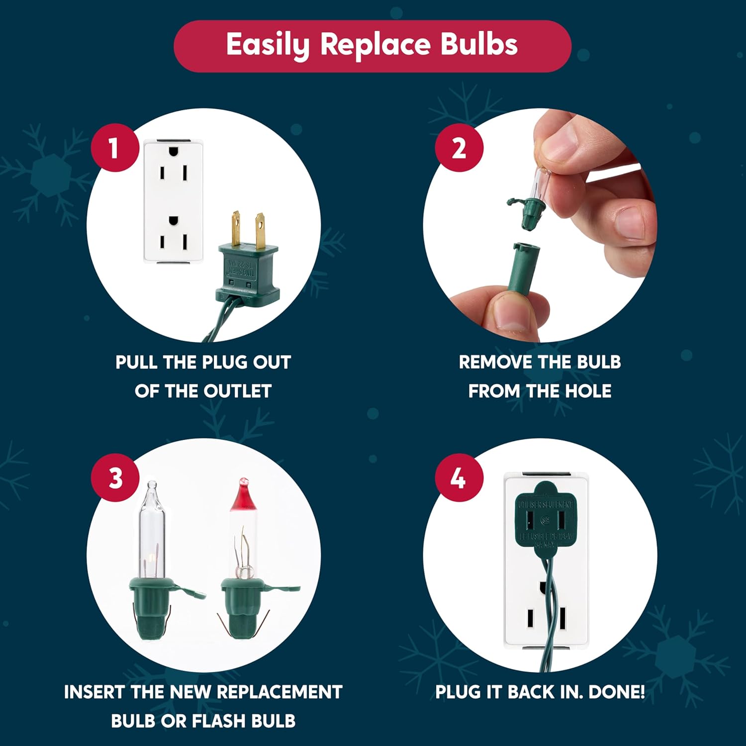 - INDEPENDENT CIRCUIT & REPLACEMENT BULBS - Enjoy a hassle-free holiday! Our lights feature an independent circuit system; if one bulb burns out, the rest stay lit. The set includes 4 spare bulbs, 2 replacement fuse, and 4 test flash bulbs., ensuring your display stays bright throughout the season without needing a full replacement.
