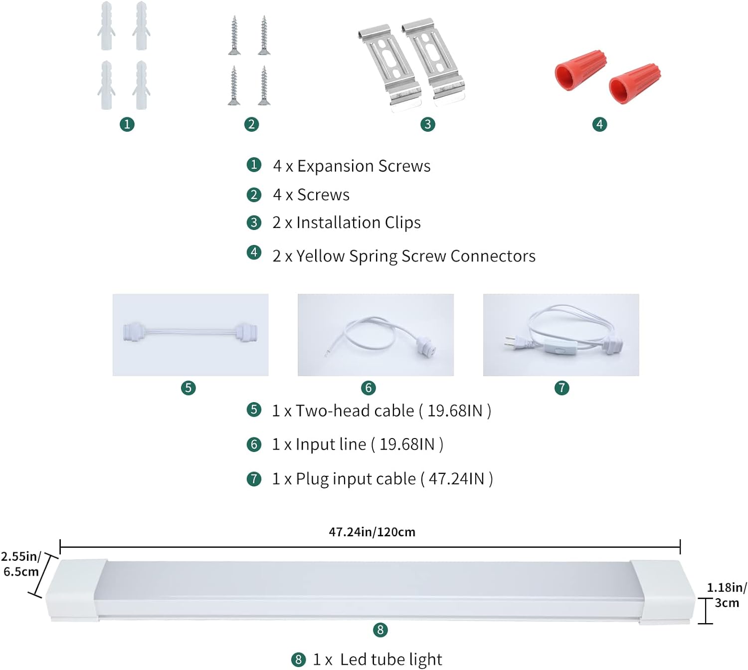 - 【LINKABLE AND NO FLICKER】This led tube light could connect up to 10 tube lights together with 19.6 inches connector cords. comfortable led shop light fixture. With 180° wide-angle beam, This led ceiling and closet light is no flickering. No mercury or hazardous materials. No UV or IR Radiation. Frosted cover for anti-glare eye protection.
