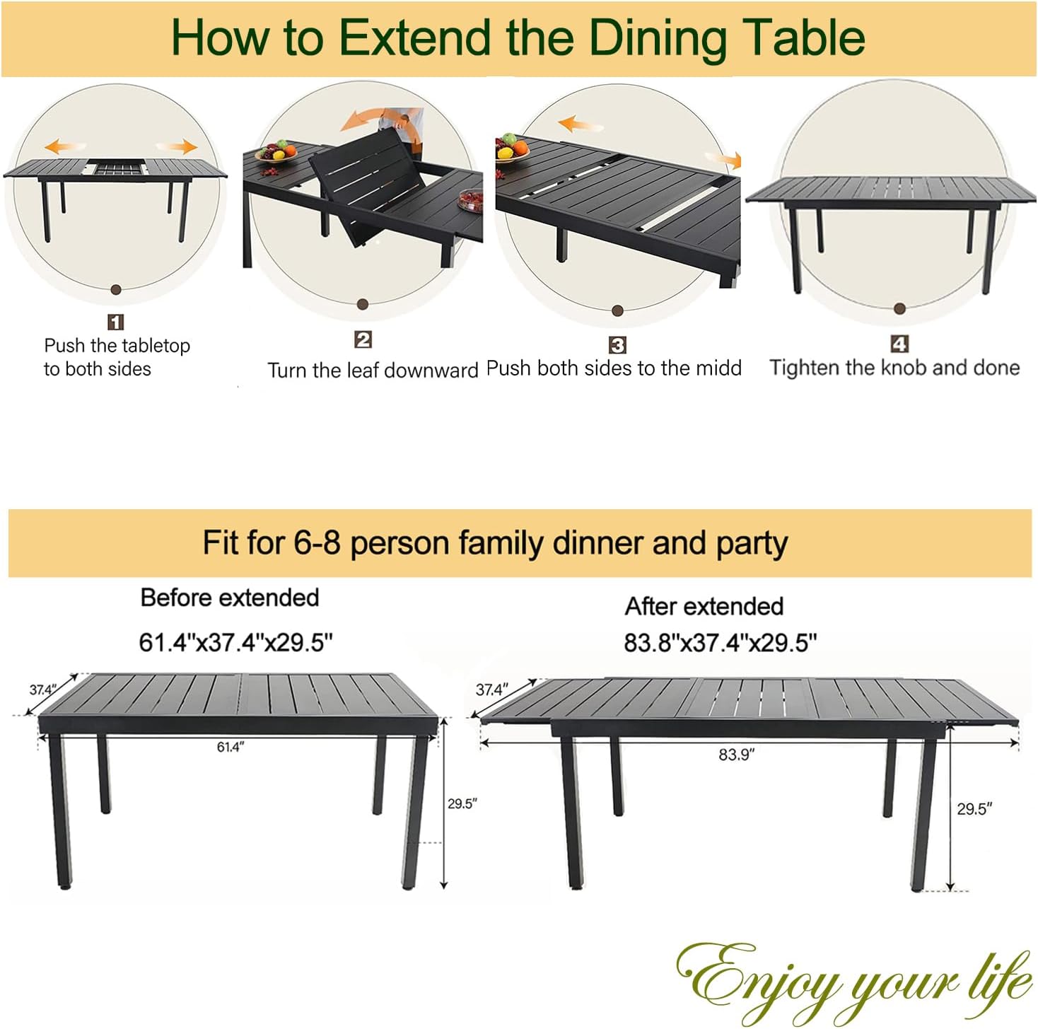 • 【Expandable Table】:This expandable dining table is over 61 inch long when in its most compact state; it grows to nearly 84 inch in length when fully extended. Fit for 7-9 person family dinner and party