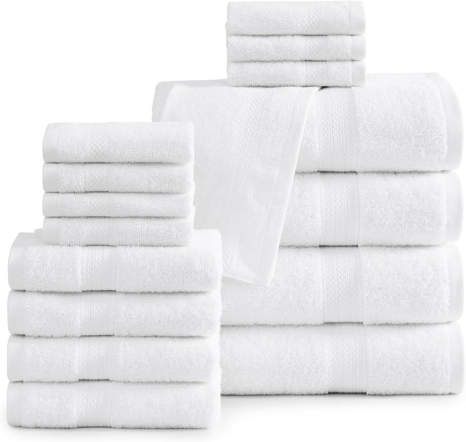 • Each 16-Piece White Towels Set includes : 4 White Bath Towels - 28" x 54" , 4 White Hand Towels - 16" x 28" and 8 Wash Cloths - 13" x 13". Crafted from premium Cotton, each bath towel, hand towels for bathroom, and wash towel promises to be soft on your skin to keep you warm and dry after you step out of the shower.