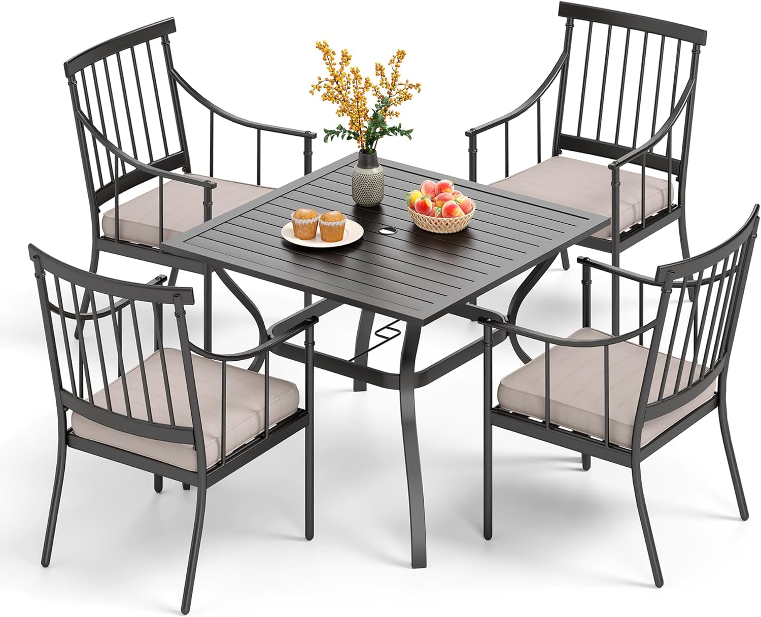 PHI VILLA 5 Piece Outdoor Dining Set with Cushion, 37” Square Metal Dining Table with Umbrella Hole & 4 Cushioned Steel Chairs for Patio, Deck, Yard