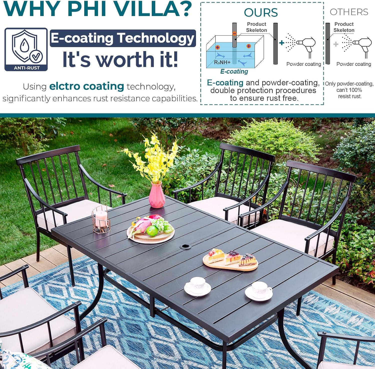 PHI VILLA 7 Piece Patio Dining Table Set with Cushion, Large Rectangular Metal Dining Table with Umbrella Hole & 6 Cushioned Iron Chairs for Outdoor, Deck, Yard