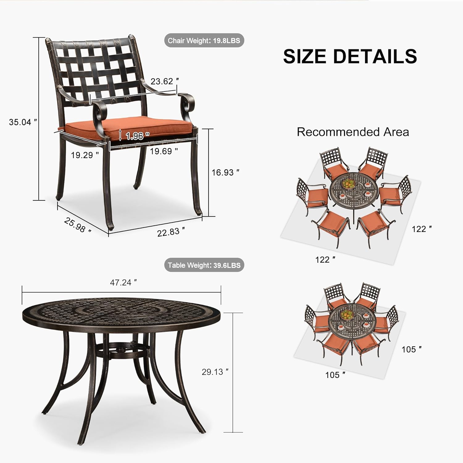PURPLE LEAF Patio Dining Set Cast Aluminum 7-Piece Patio Furniture Set with 6 Dining Armchairs and 47" Round Table, 6 Cushions Included, for Lawn Yard Garden, Lattice Brick Red Outdoor Dining Set