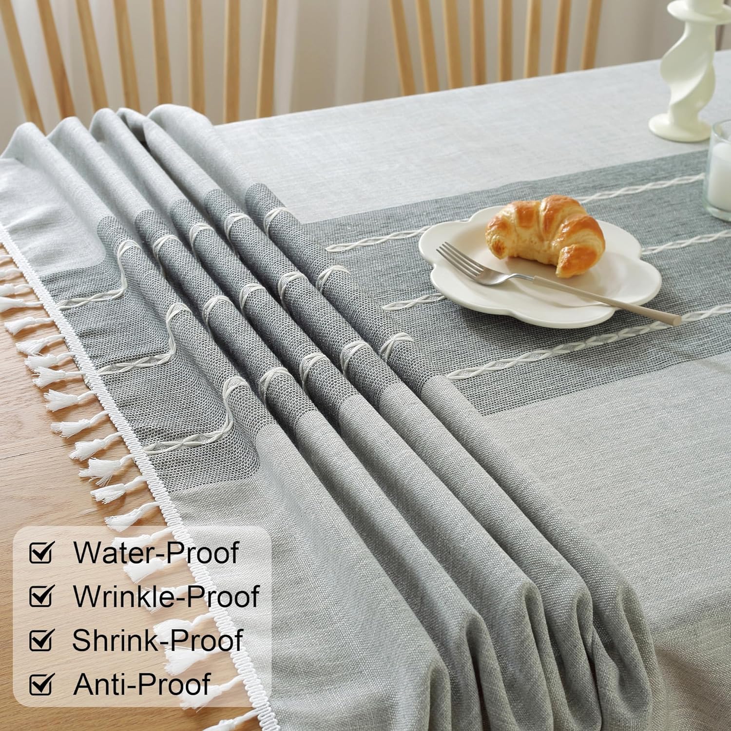 - 【Decors and Design】Tablecloths for rectangle tables adopt elegant rustic farmhouse design, neutral and sophisticated. Simple 3D embroidery design is paired with a cute cotton tassel. Table cloth overall style is simple and refreshing look. At the same time, the classic color is suitable for most home styles, creating an elegant and comfortable dining atmosphere.