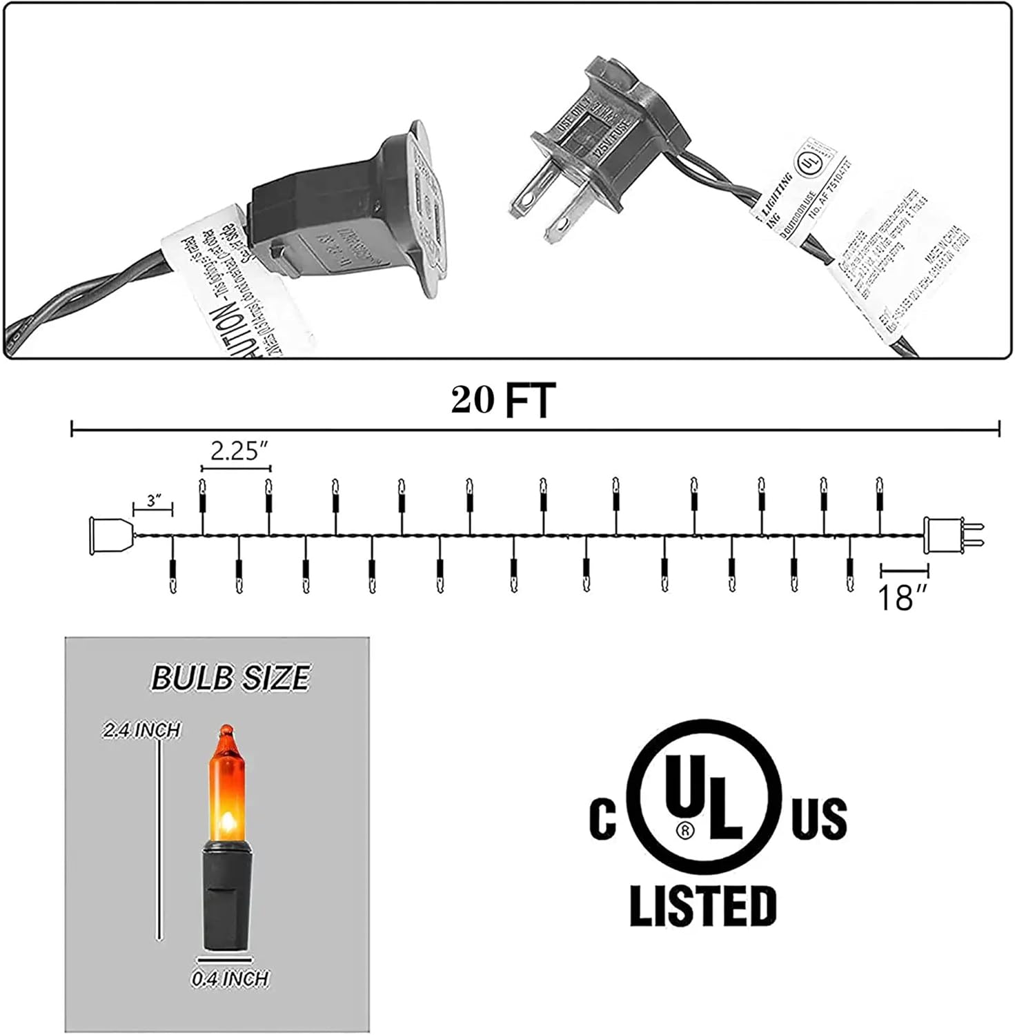 • Charming Halloween Lights: Package include 1 x 20ft mini string light, 1 x spare fuse, 4 spare incandescent bulbs. The lighted length of Halloween clear string light is 18.5 ft, the leading wire is 1.5 ft, and the bulb space is 2.25 inch, work voltage of each bulb is 2.5V / 0.42W, safety with built in 3A fuse.