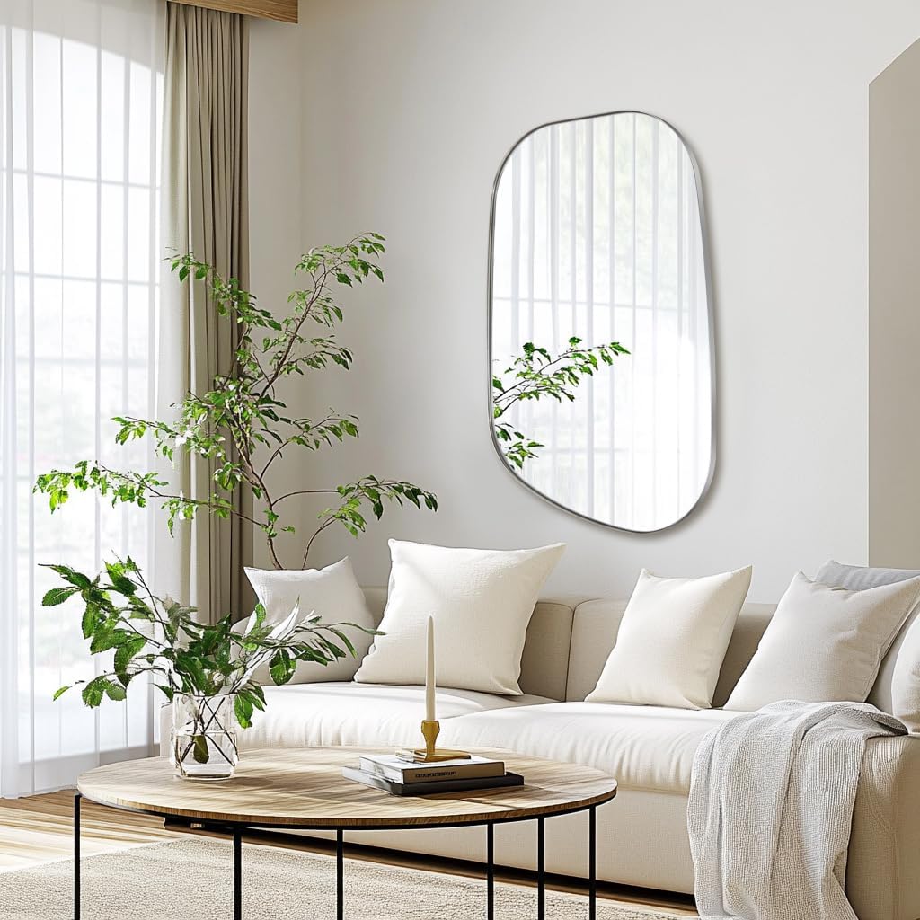 • Elegant Fluid Silhouette:This chrome mirror features a naturally curved asymmetric shape—where soft lines replace rigid symmetry for a sophisticated aesthetic. Perfect for bathrooms, entryways, or living rooms, it adds understated uniqueness to any space