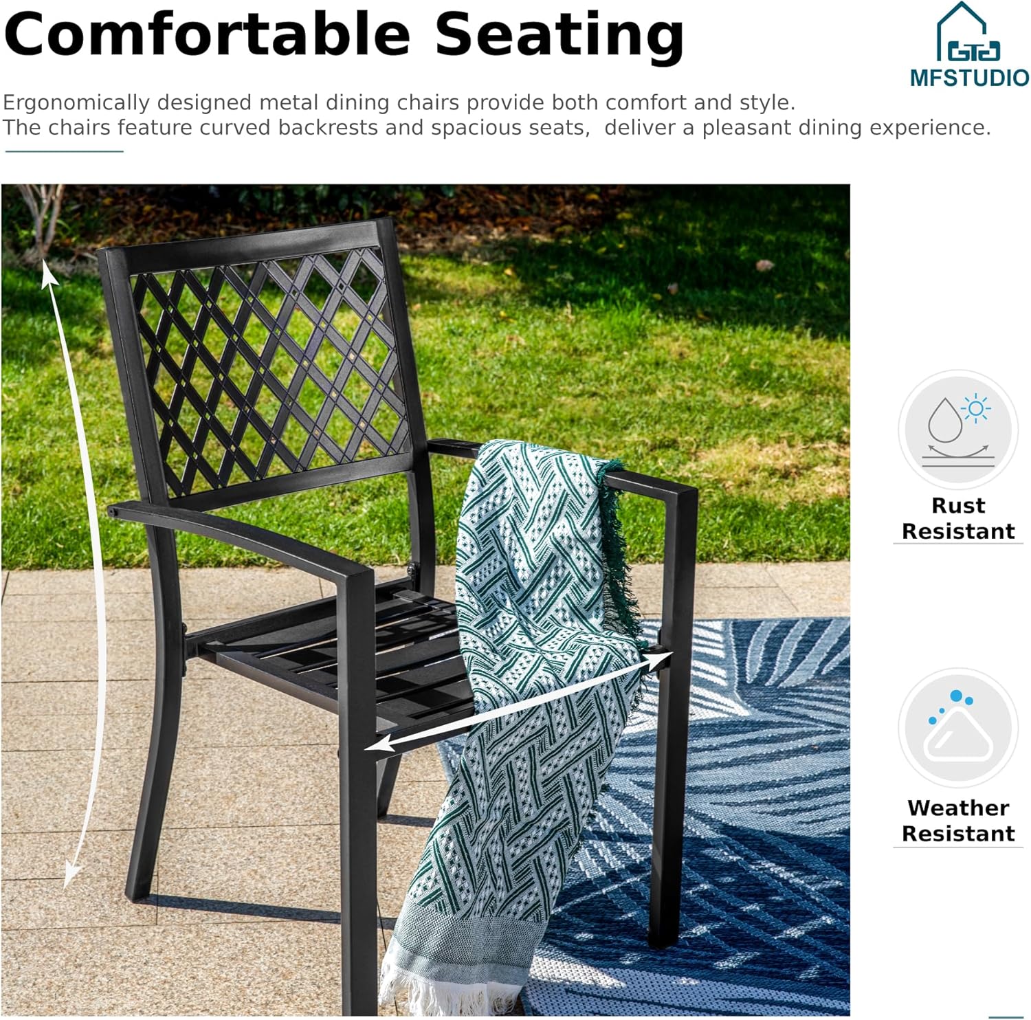 • 【Weather Resistant】: Durable wrought iron frame with e-coating needs no special maintenance, Stylish modern metal design makes the table and chairs sturdy and polished elegantly, Especially the unique chair wave back and beautiful glossy metallic Top will offers the perfect outdoor and indoor patio dining setting.