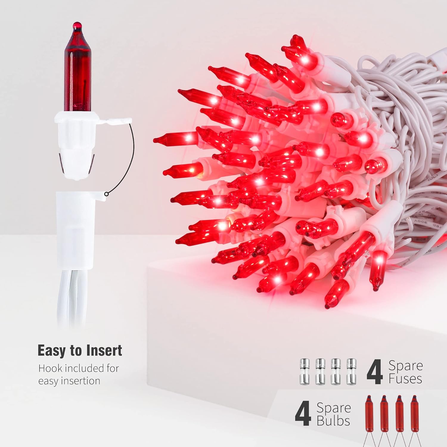 • 2 Strings in 1 Pack:100count red mini bulbs on white wire, 66ft total length.33ft 50count per strand,2.76-inch spacing, 19.6-inch lead, 5.1-inch tail.Come with 4 spare bulbs and 4 spare fuses.Ideal for Christmas,New Year,Halloween party,engagement,wedding and Valentine's Day decoration