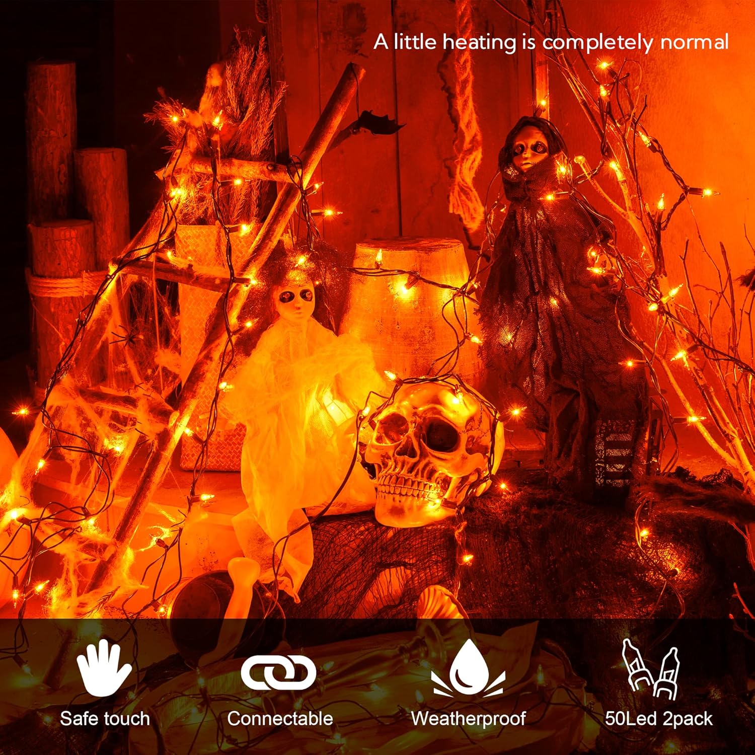• Green wire Orange Lights for Halloween:Incandescent Halloween string lights with 2 PACK 50 count orange mini Lights,13feets length and each set includes 4 Extra Bulbs & 4 Spare Fuses.Perfect for any indoor and outdoor decor.