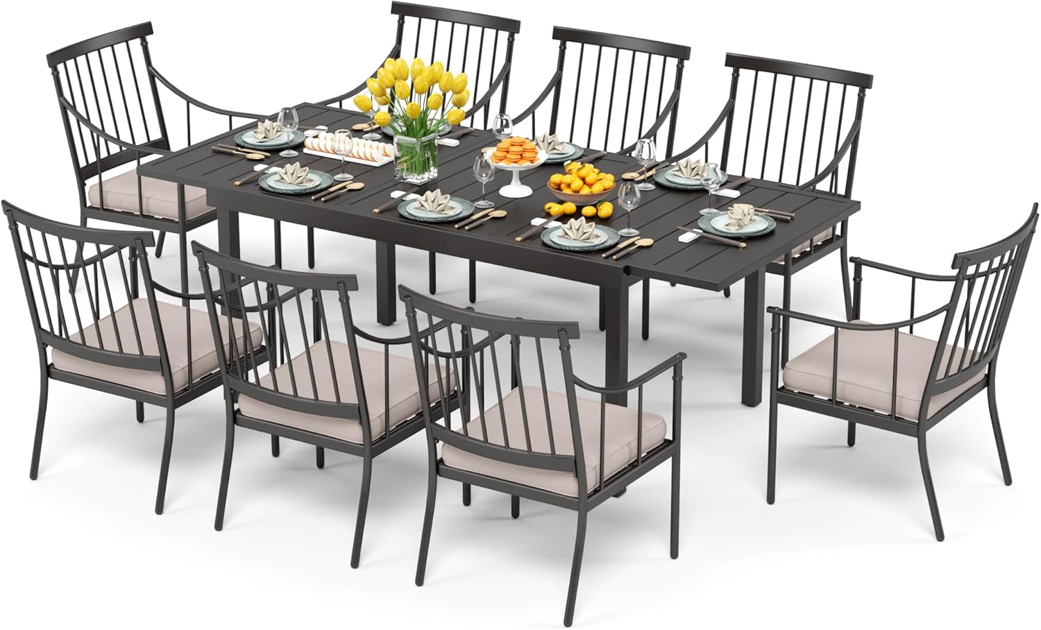PHI VILLA 9 Piece Large Outdoor Dining Table Set, Expandable Rectangular Metal Dining Table & Cushioned Steel Chairs for Patio, Deck, Yard