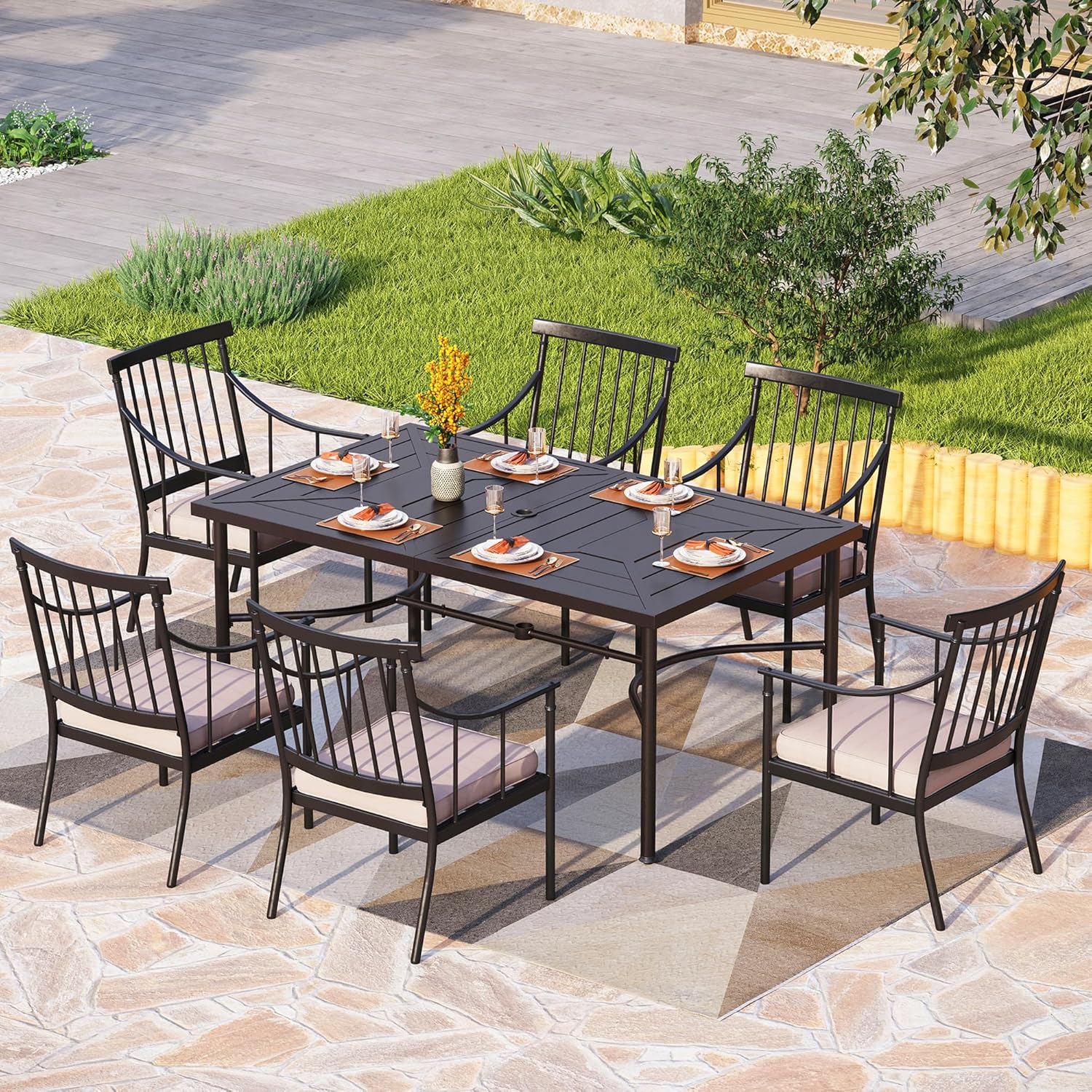PHI VILLA 7 Piece Outdoor Dining Set for 6, 64" Metal Steel Dining Table with Umbrella Hole & Cushioned Iron Chairs for Patio, Yard, Porch, Deck