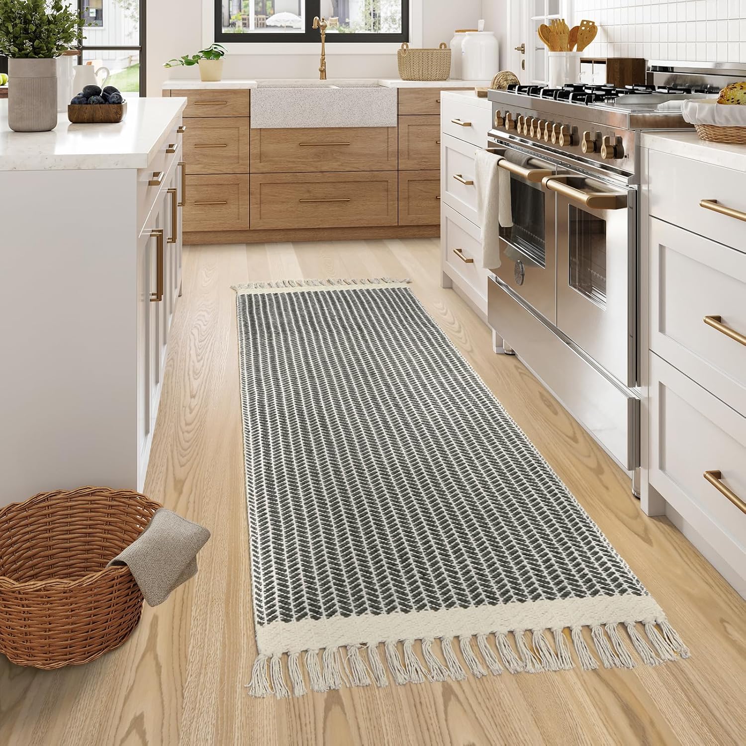 Lahome Boho Hallway Runner Rug, 2x6 Laundry Room Lightweight Entry Bathroom Woven Cotton Throw Mat with Tassels, Farmhouse Non Shedding Washable Grey Rug Low Pile Runner for Kitchen