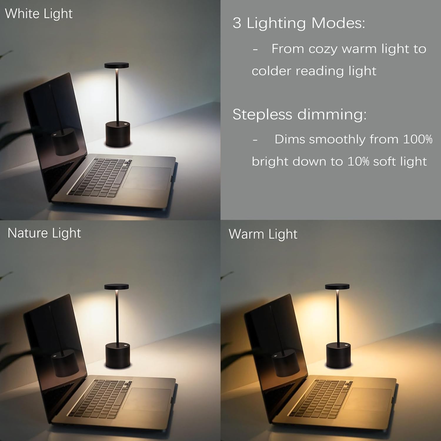 - Customize Your Light with 3 Colors & Stepless Dimming: Easily switch between 2700K (warm white for relaxation), 4000K (natural white for tasks), and 5500K (cool white for focus). Adjust the brightness smoothly from 10% to 100% to create the perfect ambiance for any activity, from reading to relaxing. Barryca rechargeable lamp conveniently remembers your last setting.