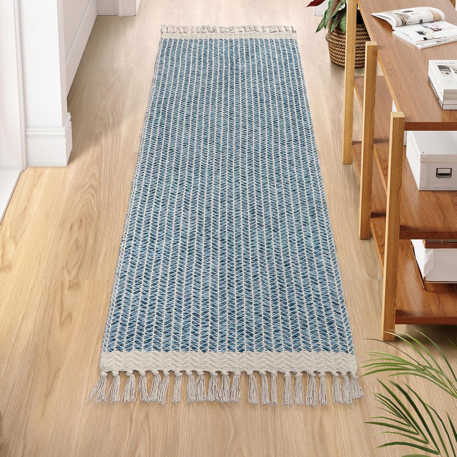 Lahome Boho Kitchen Runner Rugs, 2x6 Laundry Room Rug Lightweight Bathroom Runner Woven Cotton Throw Mat with Tassels, Farmhouse Washable Blue Rug Low Pile Runners for Hallways Entry