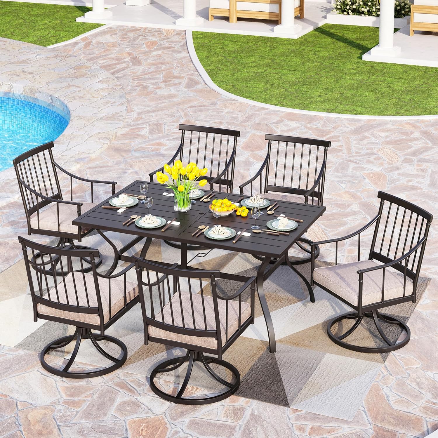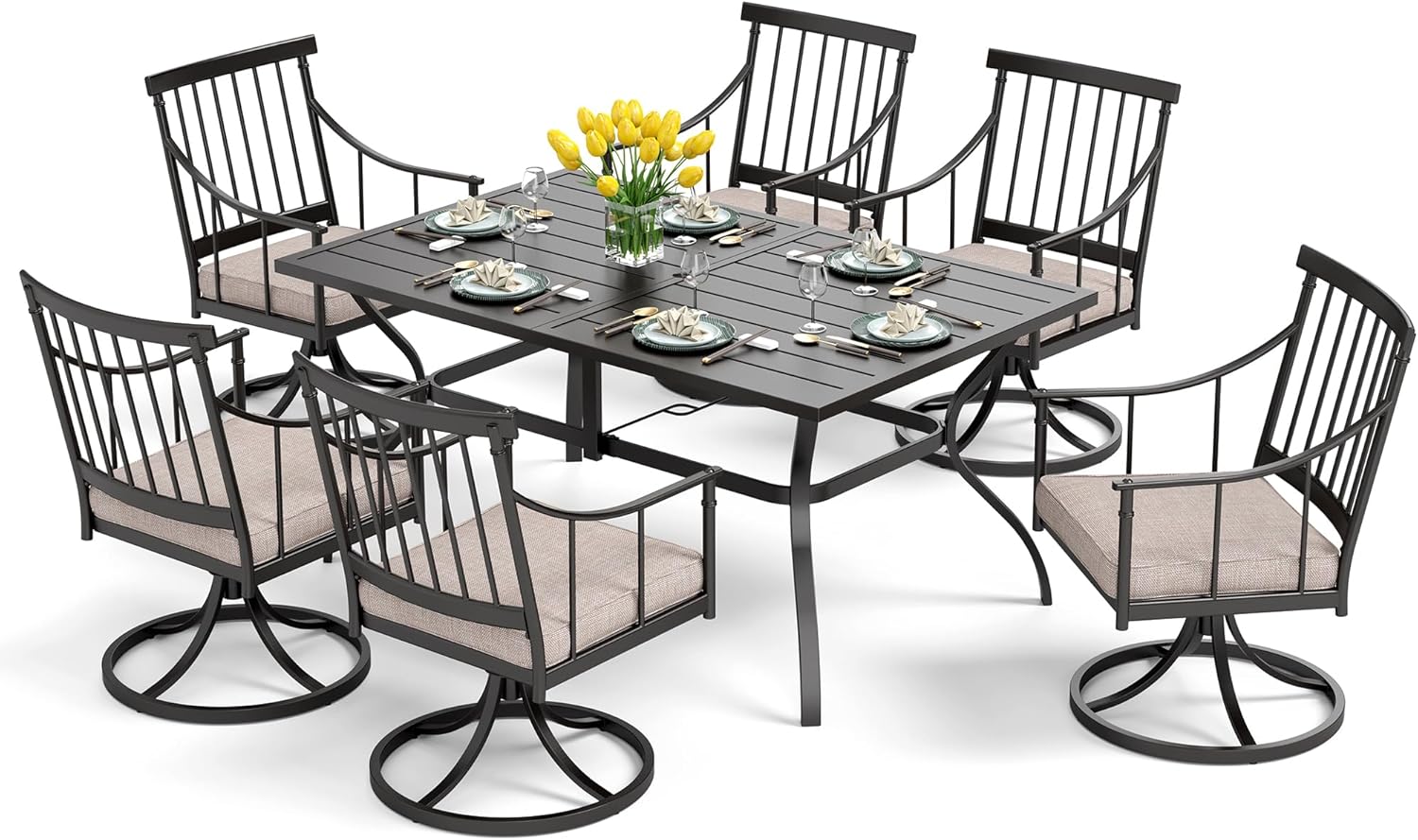 PHI VILLA 7 Pieces Outdoor Dining Set for 6, 60" Rectangle Black Steel Table with Umbrella Hole & Swivel Metal Iron Chairs with Cushions, Modern Furniture for Patio, Deck, Yard, Porch