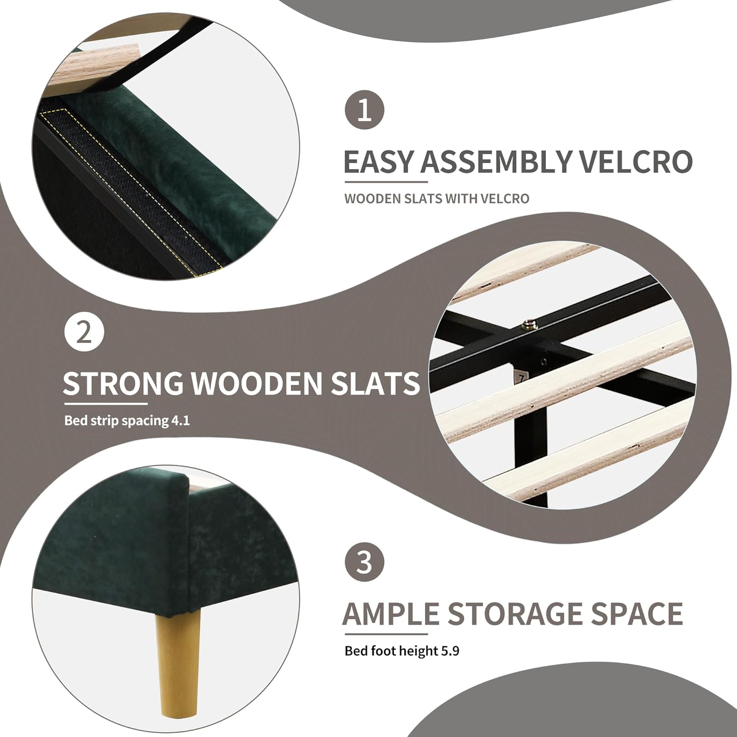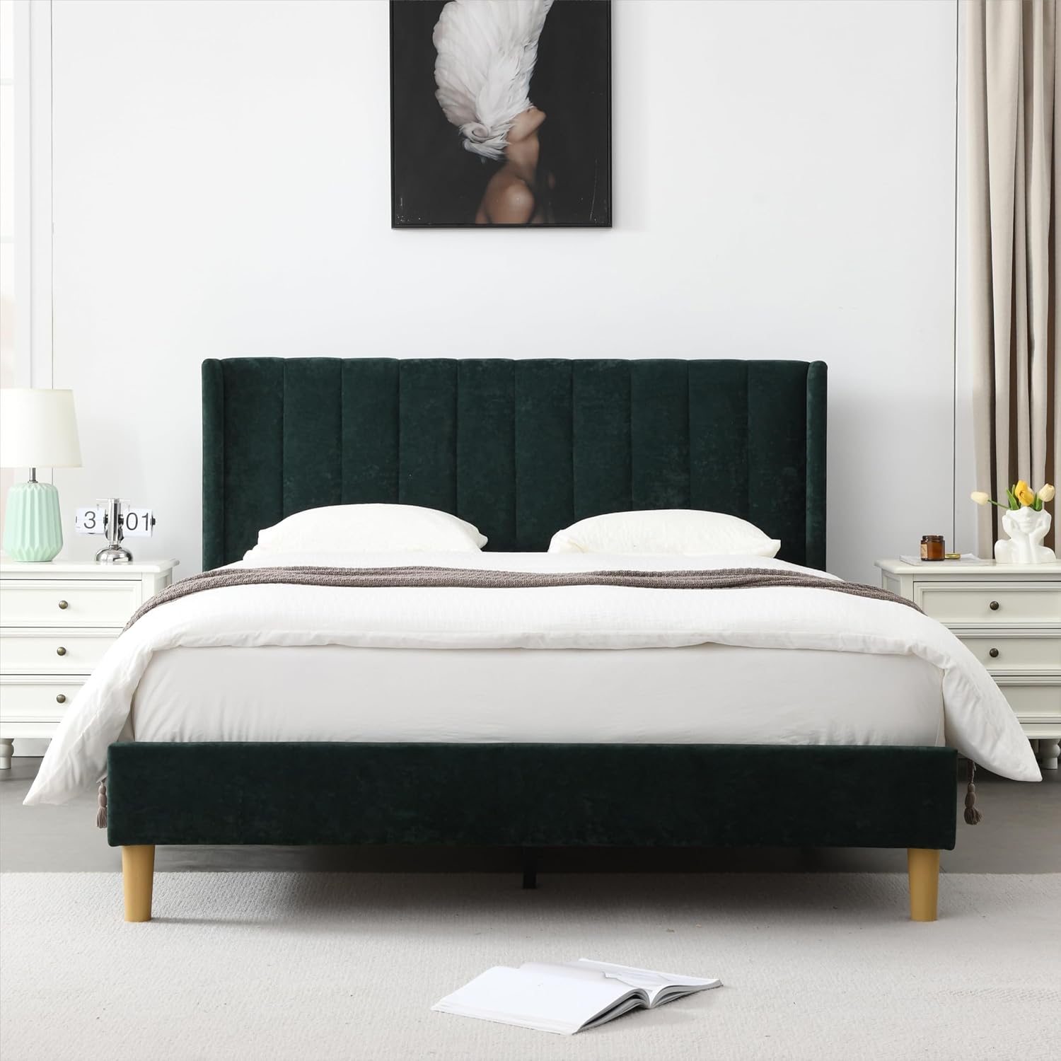 YUHUASHI upholstered Platform Bed Frame/Queen Bed Frame/Modern Geometric Double-Wing Design headboard/Velvet Fabric/Easy to Assemble no Noise (Ink Green, Queen (U.S. Standard))
