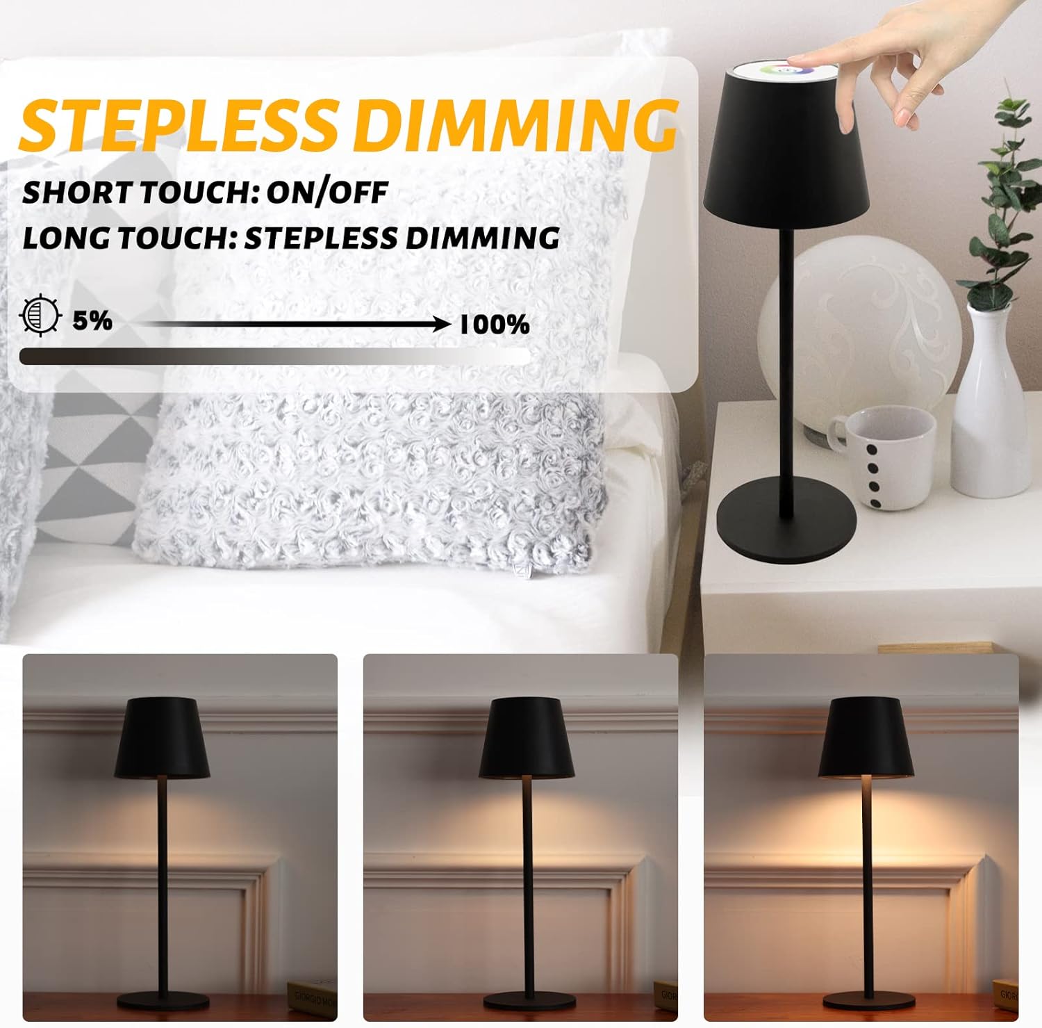 - 【Dimmable Table Lamp】The brightness of the LED desk lamp can be easily adjusted steplessly by touching the On/Off switch on the top, reflecting the perfect blend of modern technology and chic charm. First touch, light up; long press to adjust the brightness; touch again to extinguish the cordless light.