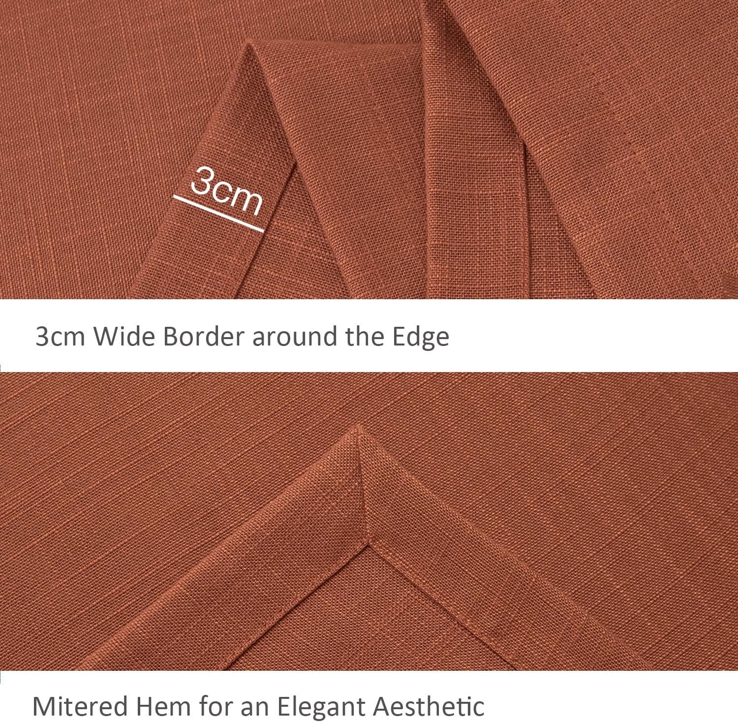 • Our table cloths are made of high-quality polyester faux linen yarn, with slubby texture. It is more durable than real linen yet soft and supple; while protecting table surface, our tablecloth also adds a sense of understated luxury to your dining scene.