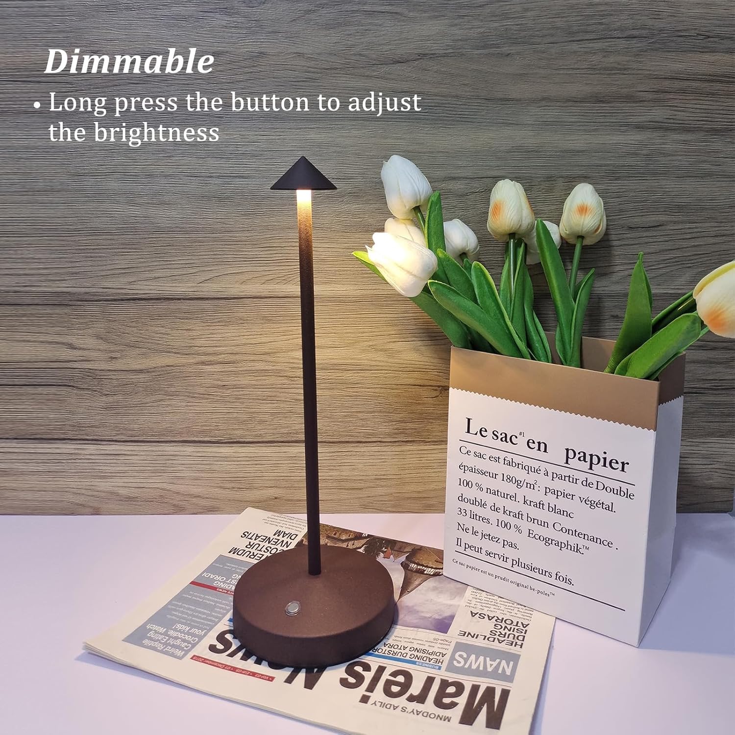 - Touch Switch & Brightness Dimming: The cordless table lamps includes a dimmable 3W LED light; Color temp:3000 kelvin; The led table lamp with two-levels of brightness can create the right atmosphere at any time - even as a bedside lamp and reading lamp by tapping the button on the table lamp to adjust the brightness; To dim the table lamp, simply applying light pressure on the touch button until the desired brightness is reached