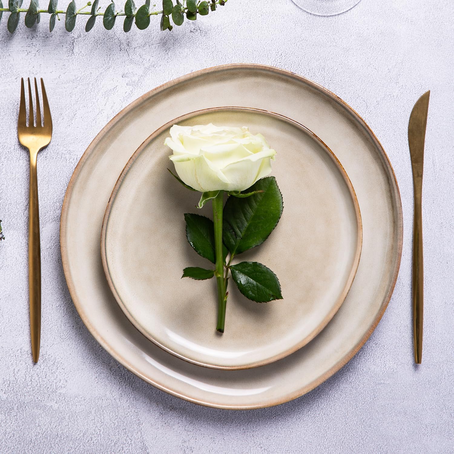 - EVERY PLATE IS UNIQUE: This dinerware set are fired with two different glazes, so the surface develops a beautiful color and makes your food look even more delicious.Since our glaze is all-natural, the surface of plates would change color on different lighting. The color may be a tad different from what you see in the images,but very item is betiful.Our glaze is also extra strong to prevent scratches from your knives and forks.