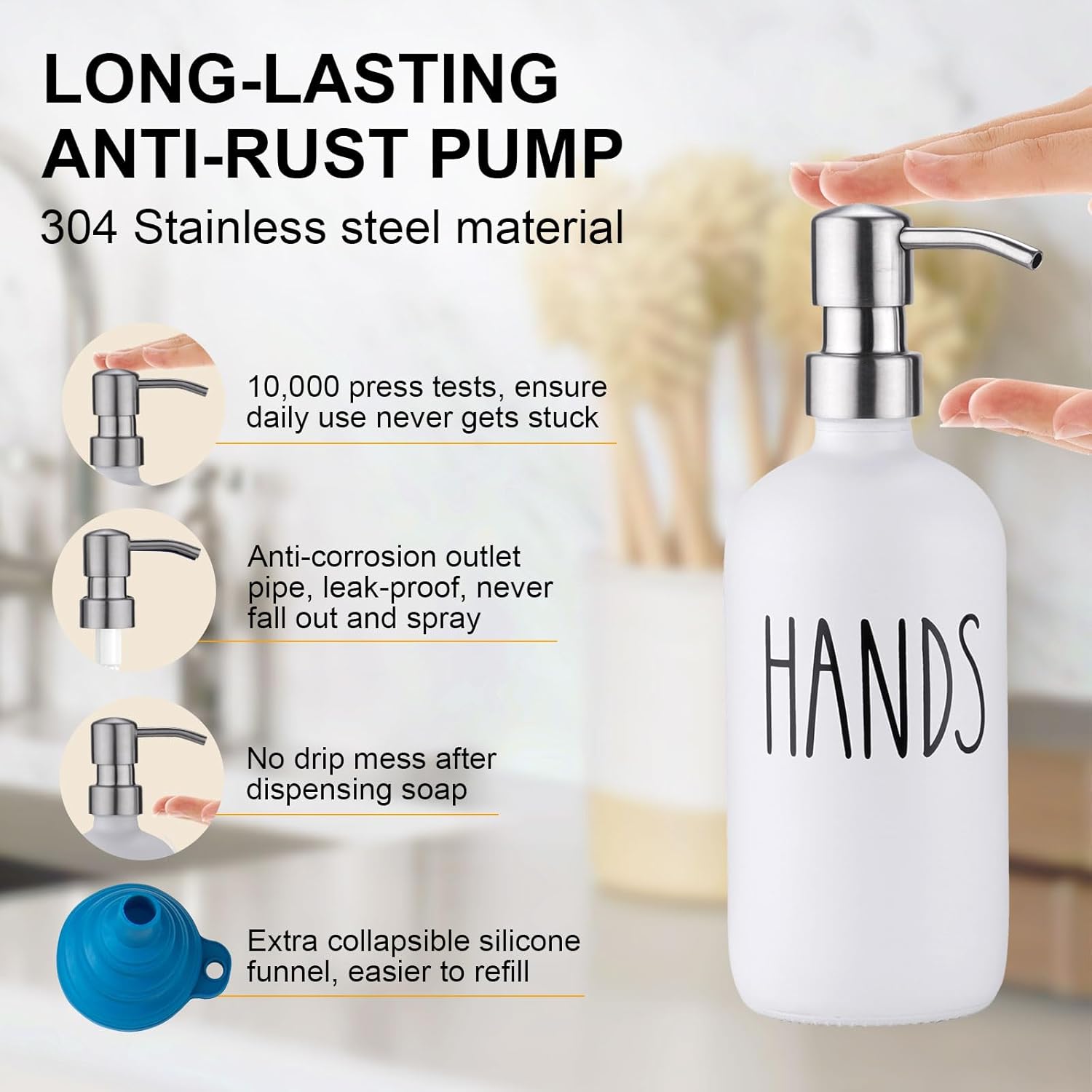 - GREAT VALUE FUNCTIONAL & AESTHETIC HAND AND DISH SOAP DISPENSER SET: 2 fortified lead-free reusable glass bottles, 2 black stainless steel pump, 1 premium dish brush set, perfect match your kitchen sink hardware, 1 collapsible silicone funnel, 1 white durable silicone soap dispenser tray, elegant Hand &Dish Soap label, suitable for any style of home kitchen decor, A beautiful addition to your kitchen counter.