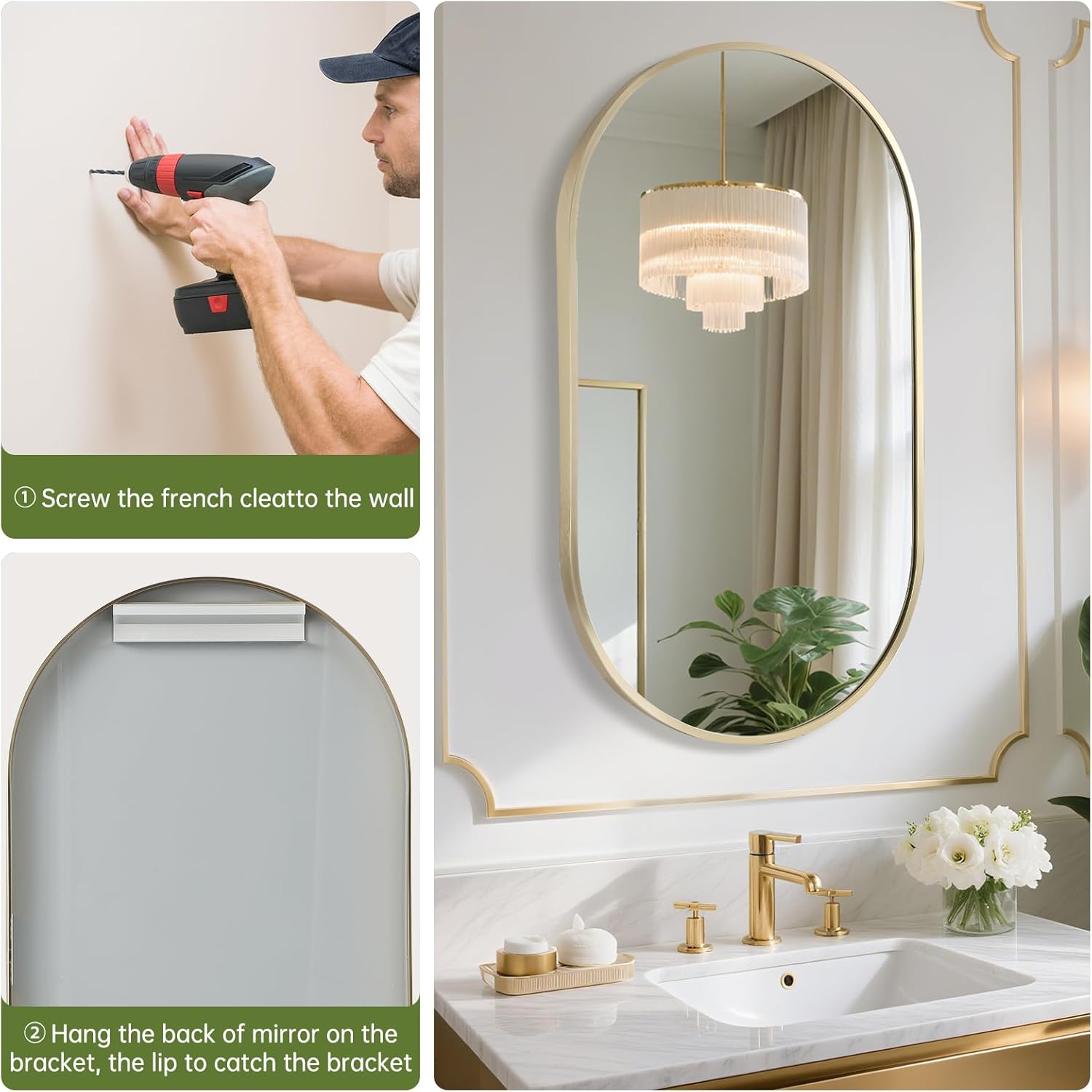 - 【Easy to Install】The gold mirror for bathroom are easy to install, just select two holes, drive the screws into the wall and hang the mirror on the screws to complete the installation. The gold oval mirror can be hang horizontally or vertically depending on your preference, and the reflection of the brushed gold mirror also enhances the light in your home.