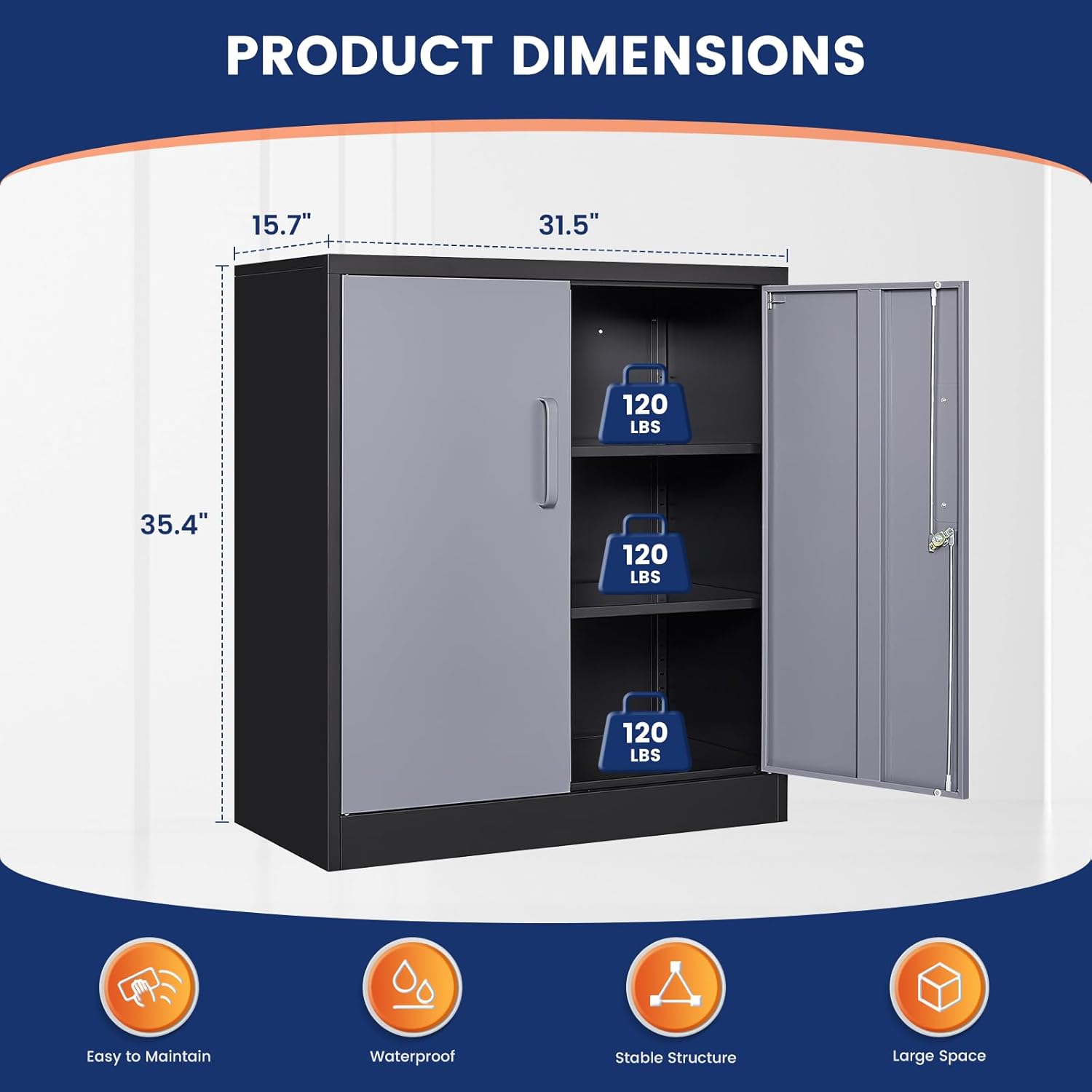 - 『EASY ASSEMBLING』: 35.5 inch×31.5 inch×15.7 inch (H x W x D). 2 wing doors with a 180°opening angle. The garage storage cabinet is knock-down structure, when you receive it, you need to assemble. The package comes with detailed assembly instructions, easy to assemble.