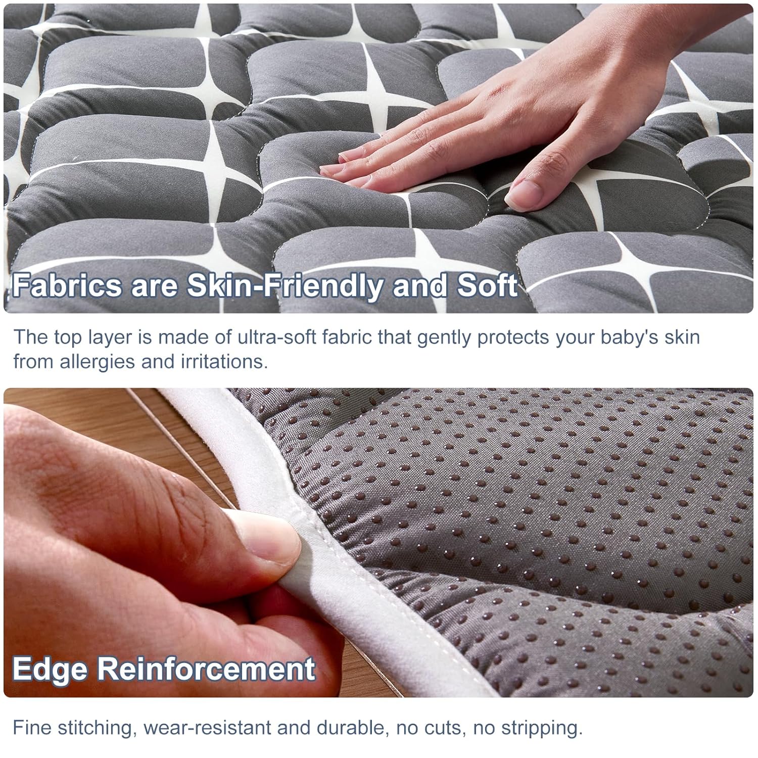 • Easy to clean: No worries at all about mats stained with urine, milk, juice and other stains, our mats are machine washable and can be washed in a large washing machine and dried at low temperatures, which is very convenient, especially for busy parents.