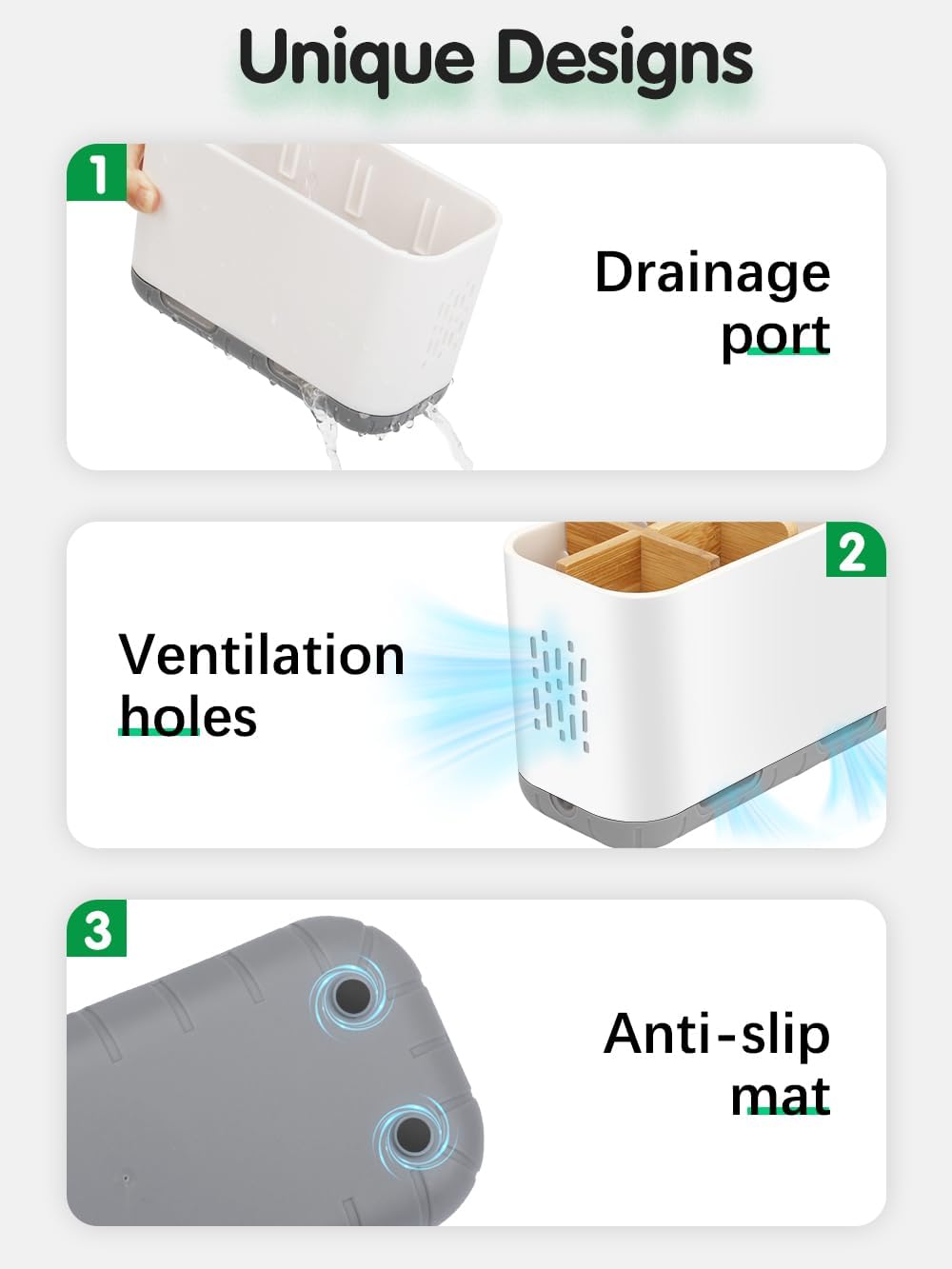 • Drainage and Ventilation:The toothbrush and toothpaste holder are designed with anti-slip and drainage features. There are also ventilation holes designed at the bottom of the toothbrush holder for quick drainage and to keep the surface dry