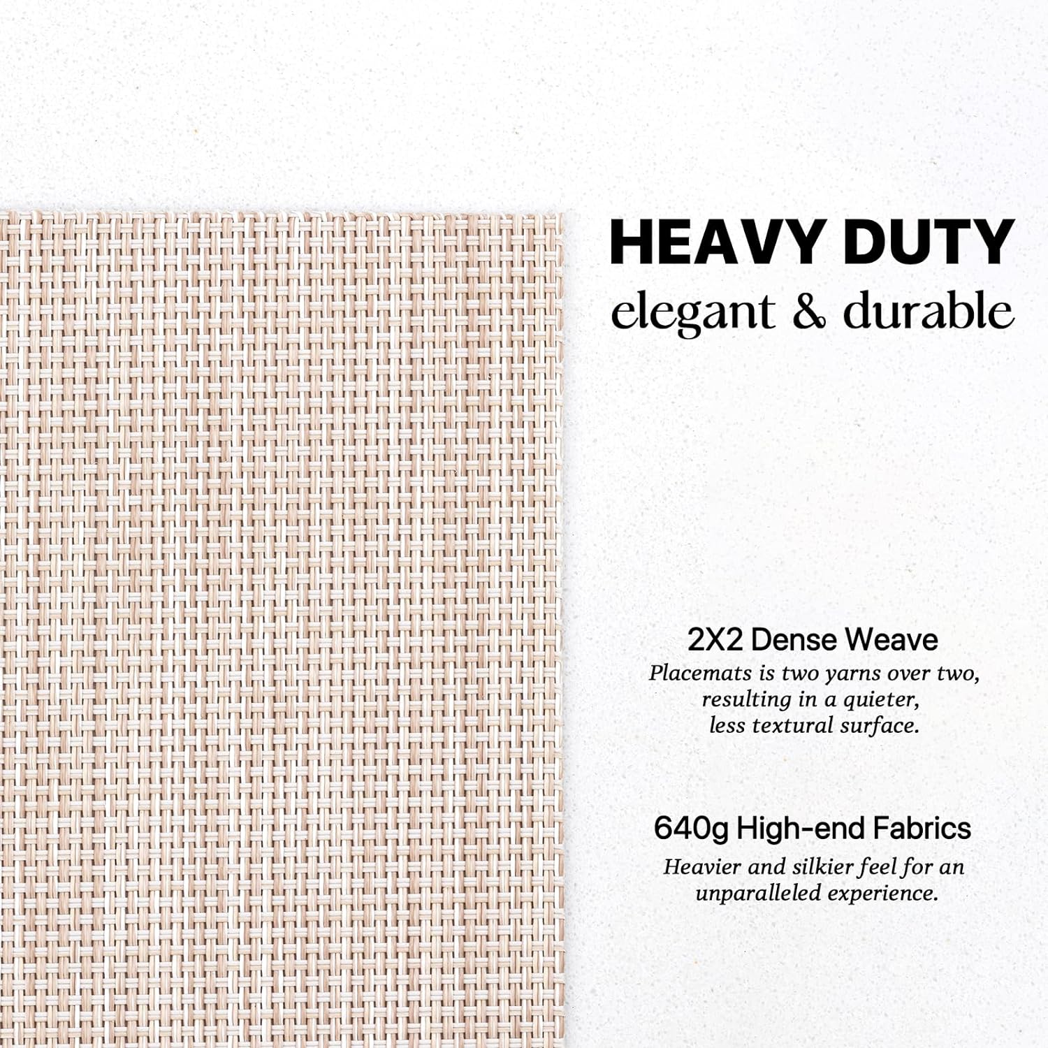 • HEAVY-DUTY:We uses the German-imported higher grammage vinyl material (Specialty PVC)than other placemats on the market,plus the precise,dense weave craftsmanship to give the woven placemats a thicker feel and make the place mats long-lasting.