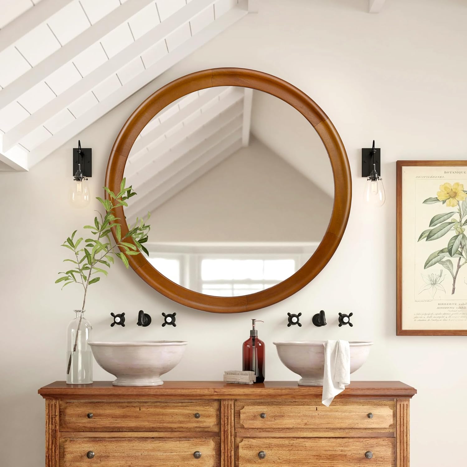 • [Great Design]This elegant 36 inch round mirror features a beautiful walnut wood frame with a circular design that creates a smooth transition from the mirror to the frame. The warm, natural tones of the wood add a touch of warmth and sophistication to any space.