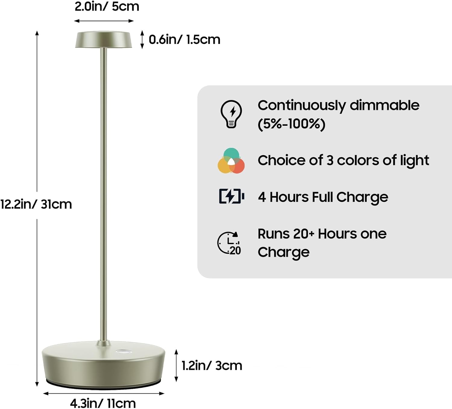 • Cordless Table Lamp: Rechargeable lamps design is simple and stylish, with a slender body that not only reduces visual obstruction but also enhances stability, making the table lamp less prone to tipping over.