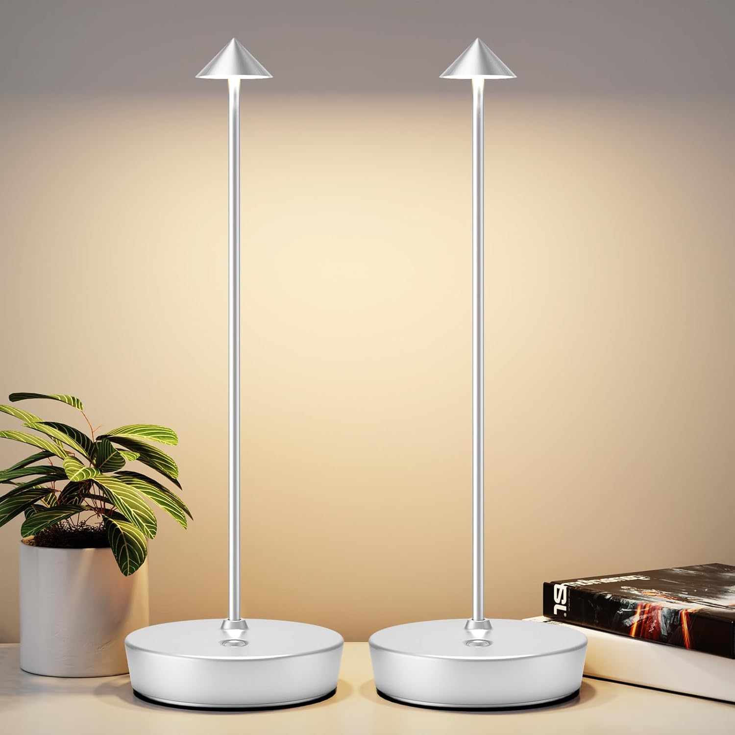 2Pack Rechargeable Cordless Table Lamp, Portable Powered LED Battery 6000mAh Metal USB Desk Lamp, 3 Levels Brightness Light for Restaurants Outdoor (2pack Silver)
