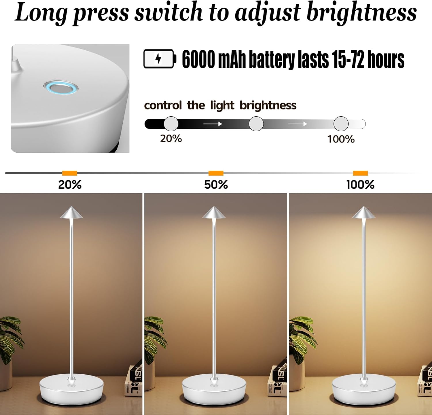 • 【Extended Battery Life】Say goodbye to constantly charging your desk lamp. With its powerful 6000mAh battery, our Cordless lamp can provide illumination for up to 15-72 hours, depending on the brightness level. Enjoy uninterrupted productivity or relaxation without the hassle of tangled cords.