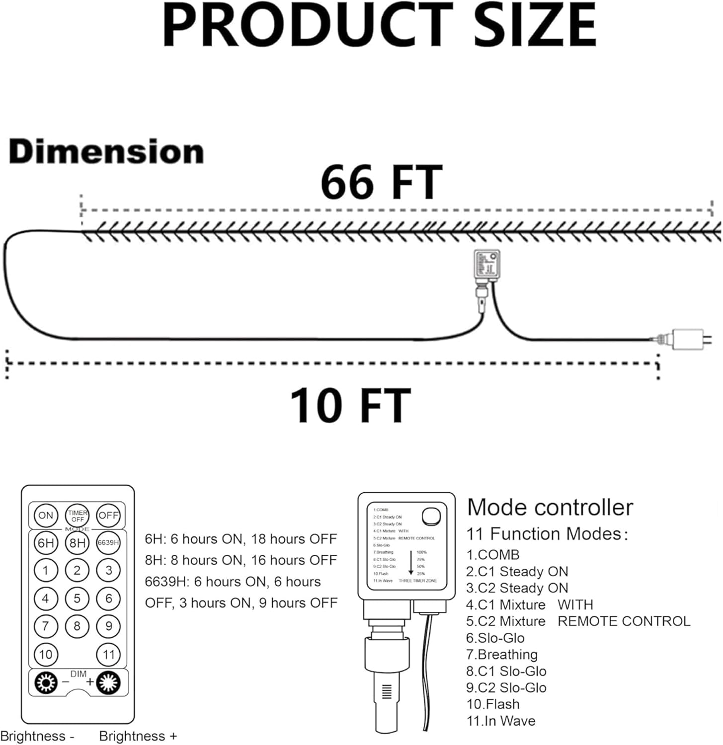 • Remote Control: These string lights come with a wireless remote, enabling personalization of the lighting modes, timer, and brightness. The lights feature 11 different lighting modes, and with the "DIM" button, you can adjust among 4 levels of brightness. The lights also have 3 choice of timer settings.