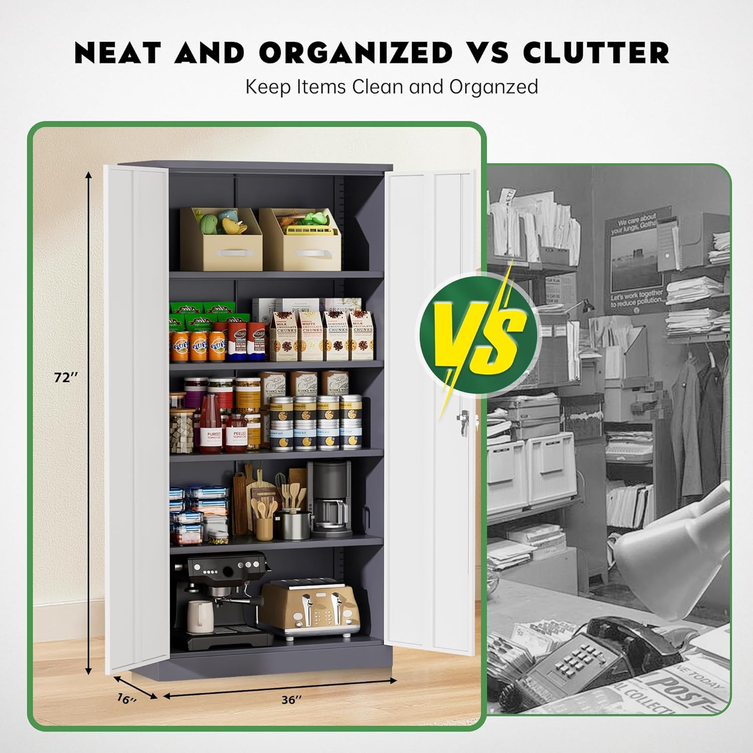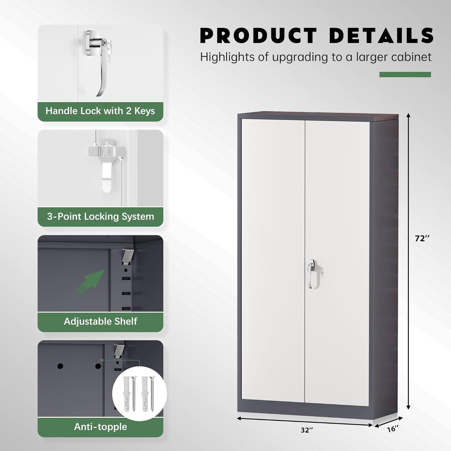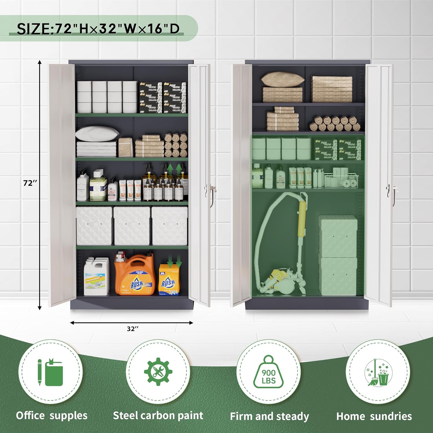 - 【Humanity Design】Greenvelly collection of metal storage cabinet adopts adjustable shelves, which can adjust the height of different partitions according to the size of stored items. Utility metal storage cabinets allow you to easily store various documents and tools. The sturdy material is not easily deformed, and its load-bearing capacity is ahead of most metal cabinets of the same model. It's absolutely safe to use!