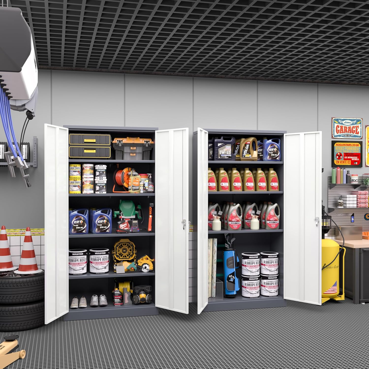 Greenvelly Metal Garage Storage Cabinet, Tall Locking Storage Cabinet with 2 Doors and 4 Adjustable Shelves, Steel Tool Cabinet, Lockable Filling Cabinet for Home, Office, Garage, School (Gray White)