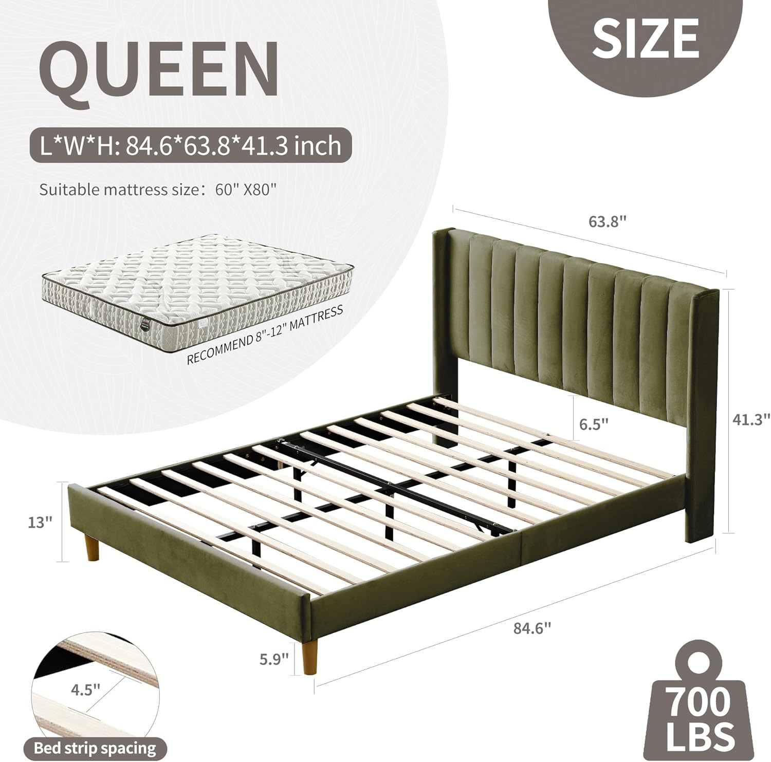• [PRODUCT SIZE] QUEEN size : 84.6 inches long x 63.8 inches wide x 41.3 inches high, 8-12 inches mattress is recommended.