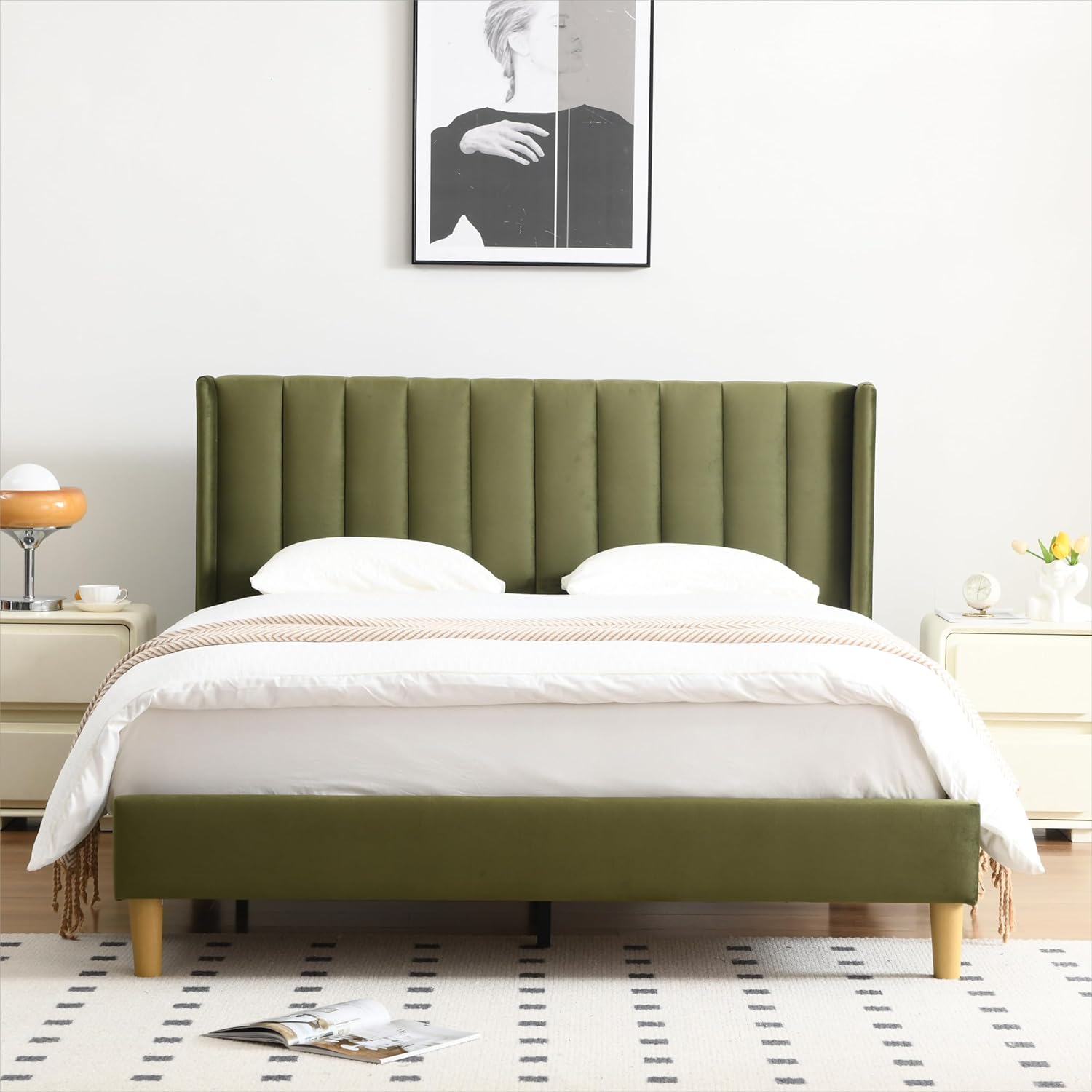YUHUASHI upholstered Platform Bed Frame/Queen Bed Frame/Modern Geometric Double-Wing Design headboard/Velvet Fabric/Easy to Assemble no Noise (Grass Green, Queen (U.S. Standard))